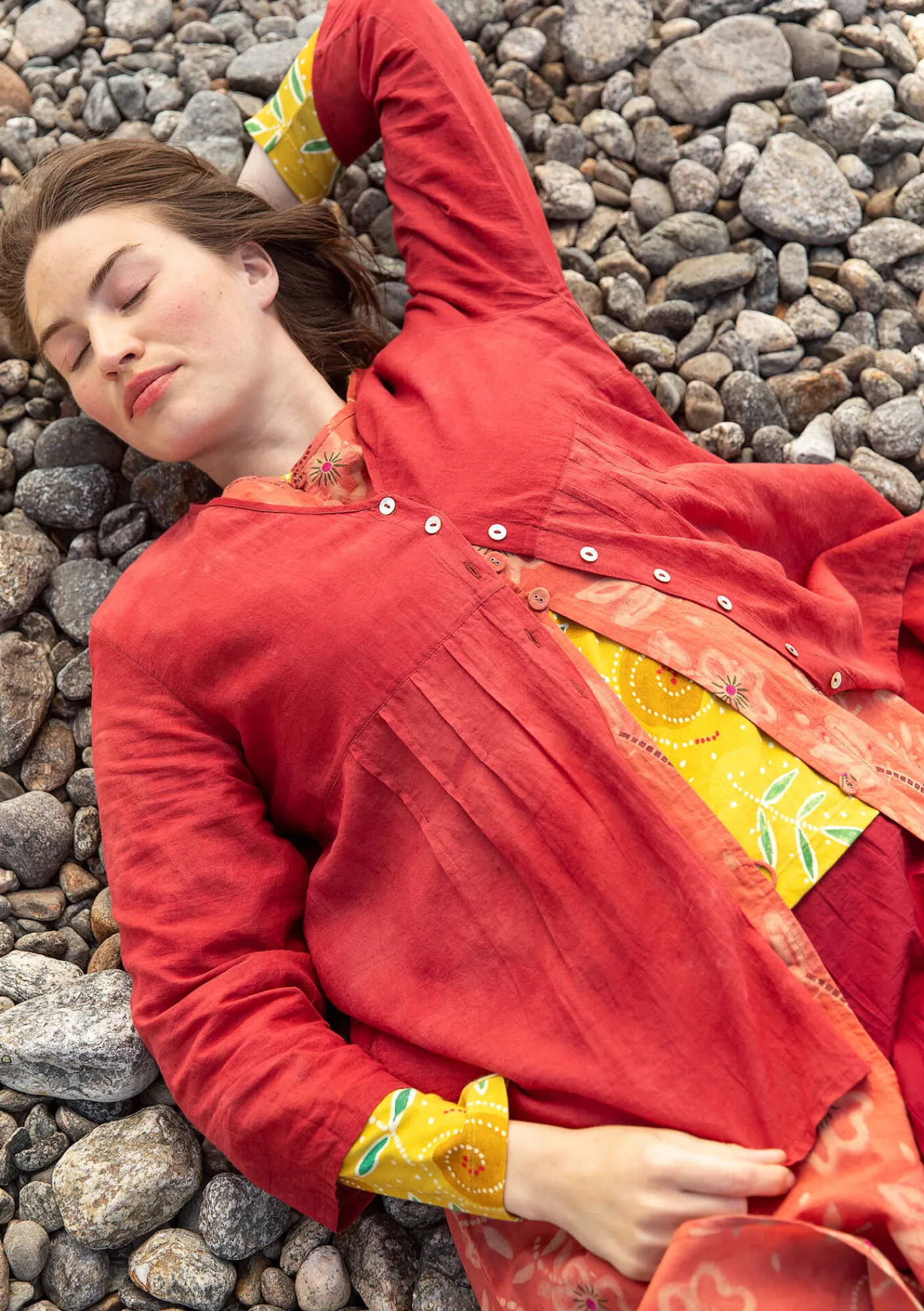 Genomknäppt blus som är färgad med växtfärger. Avskuren under bysten med stråveck både på fram- och baksidan. V-ringad hals, lite längre trekvartsärm samt fickor i sidorna.