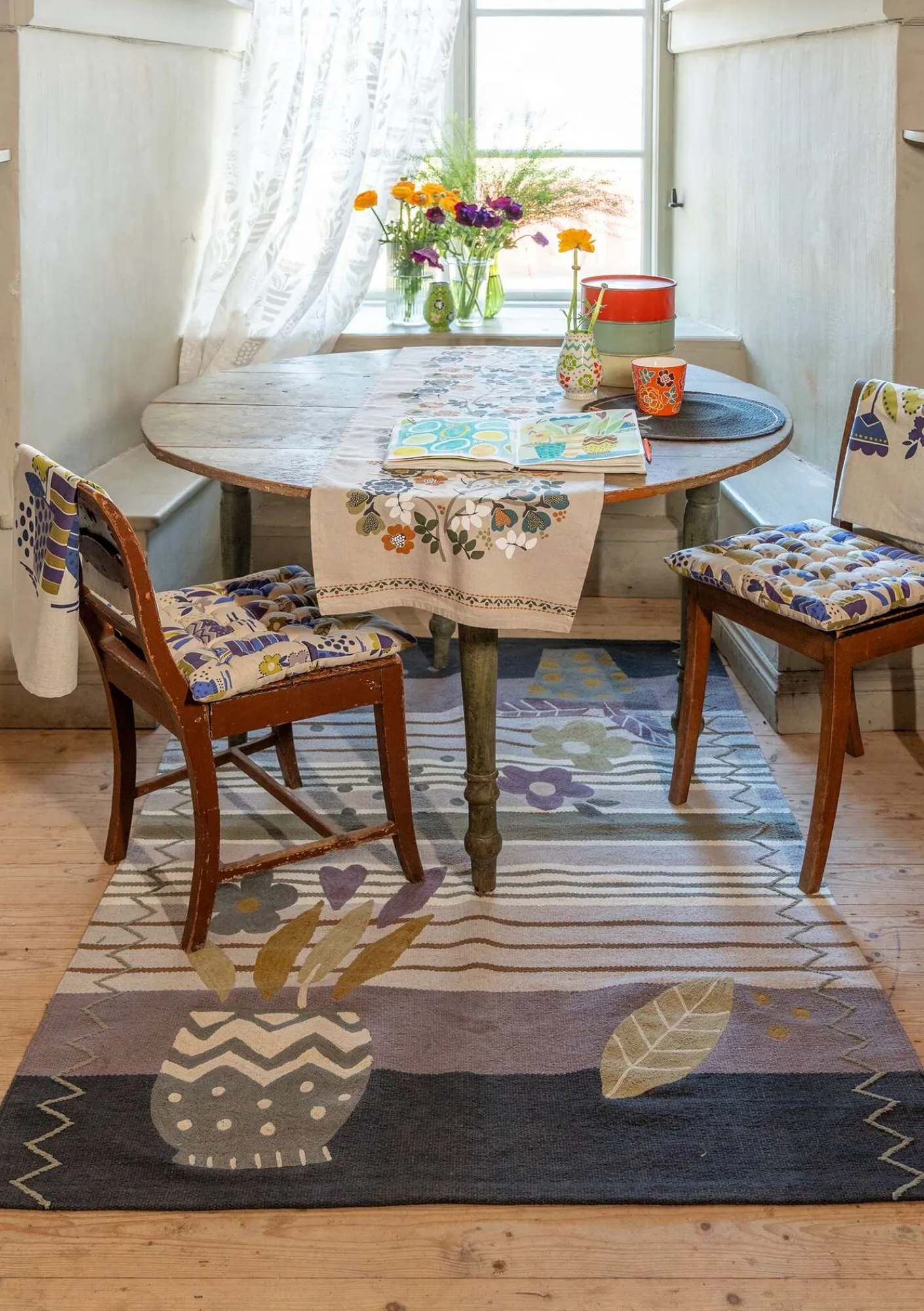 Vävd matta med garnfärgade ränder i ekologisk bomull, prydd med broderade blommor i krukor.