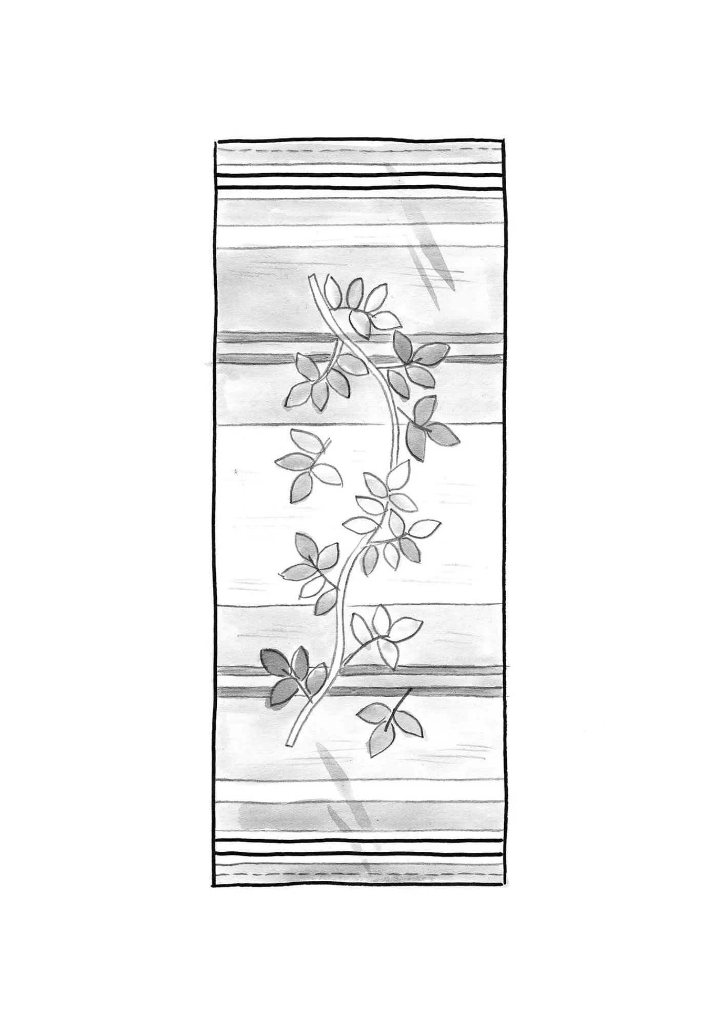 Vävd matta med garnfärgade ränder i en tålig kvalitet av ekologisk bomull. Dekorerad med broderade blad som är placerade i mitten av mattan.