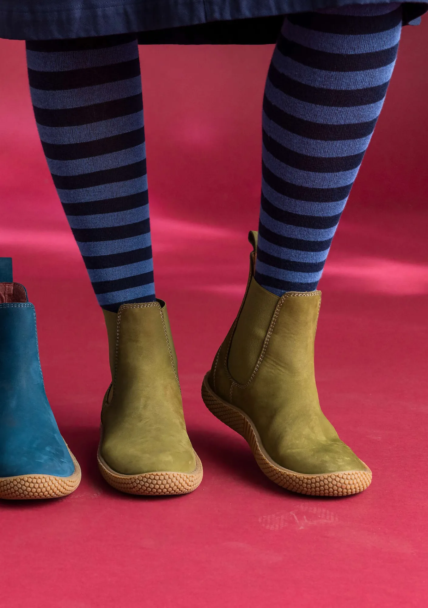 En praktisk känga, enkel att dra på med rejäl resår i skaftet. Vackra färger i nubuck. Hälla baktill för att enkelt kunna dra på sig.