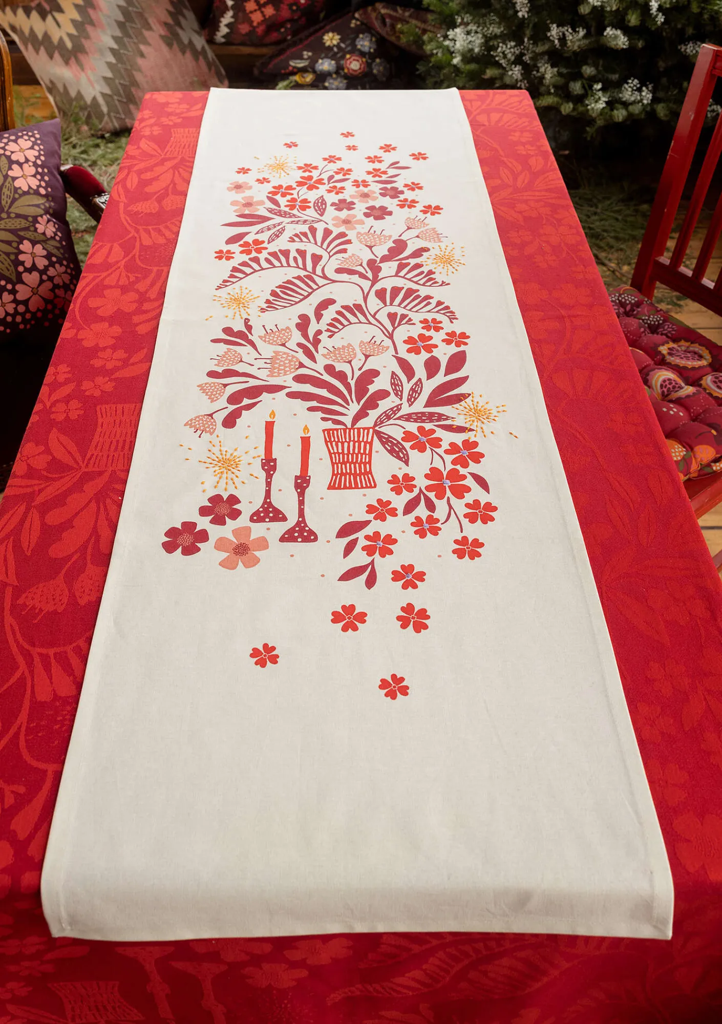 Härlig löpare med tryckt motiv av frodiga blommor och ljusstakar med broderade detaljer som glimrar till. Fin att lägga direkt på bordet, eller i kombination med en annan duk under.
