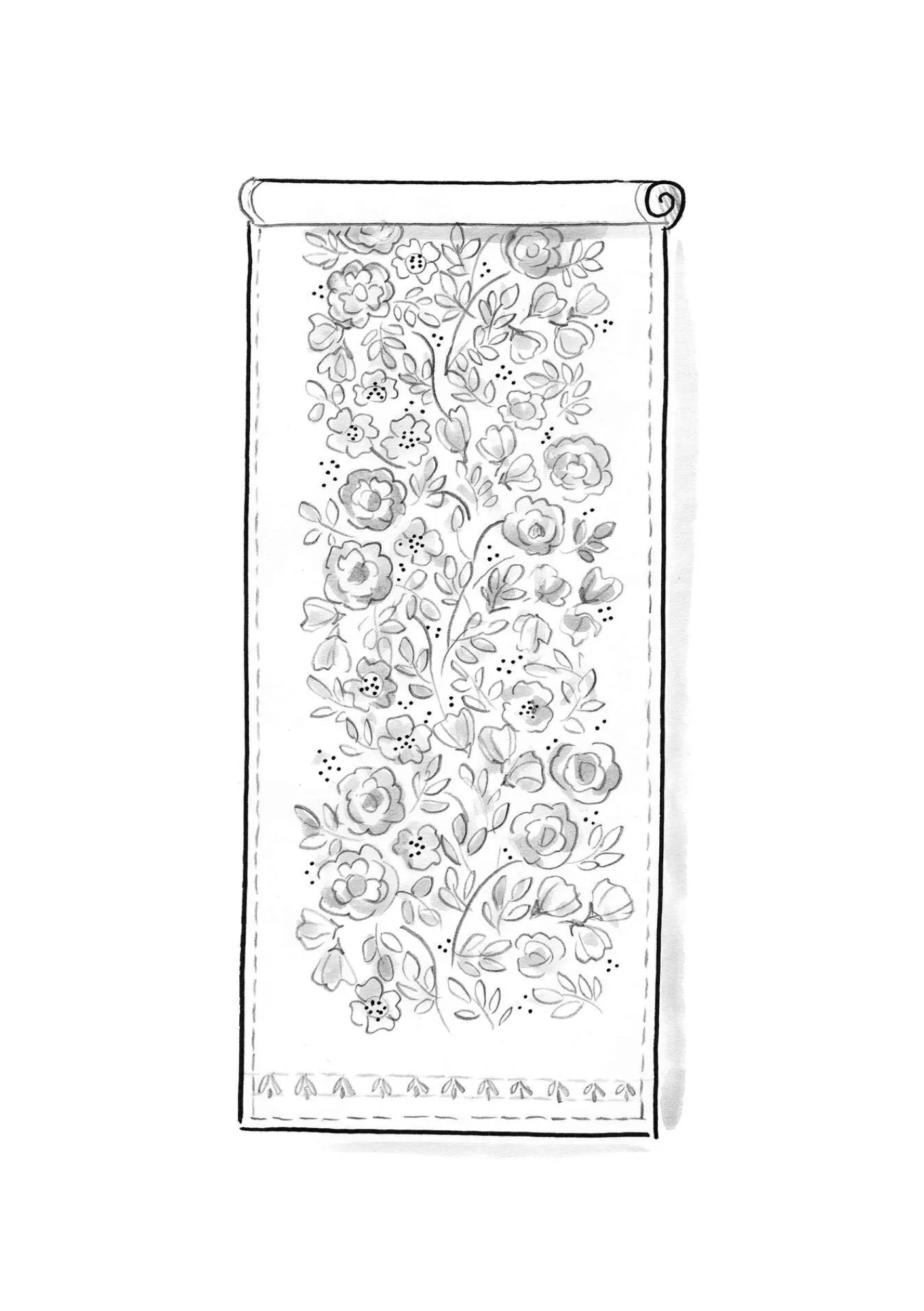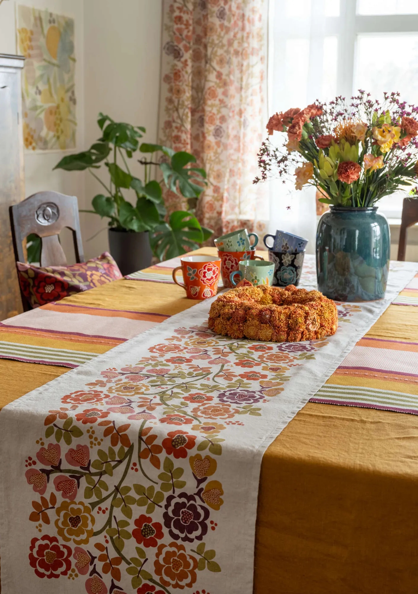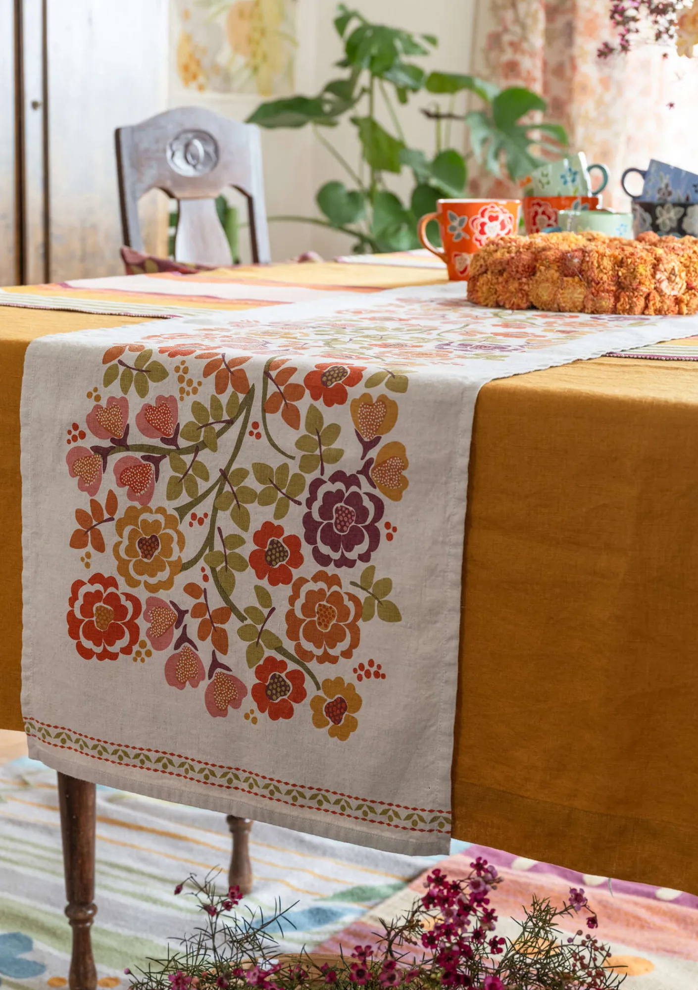 Vacker löpare med det placerade mönstret ”Wild rose” och dekorativa bårder på kortsidorna, screentryckt på en väv i en mix av lin och ekologisk bomull.