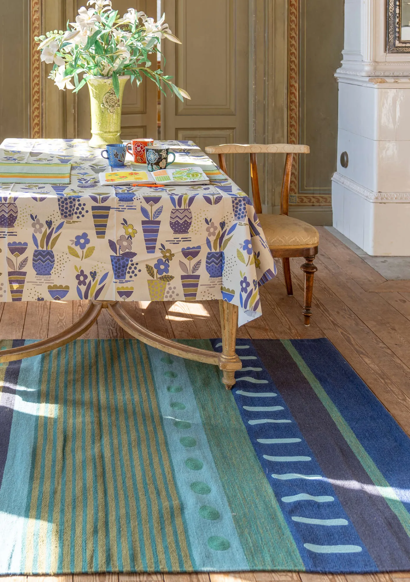 Större randig ullmatta som piggar upp alla slags golv med sin härliga färgmix av oregelbundna ränder. Slitstark ullkvalitet med pigga broderier.
