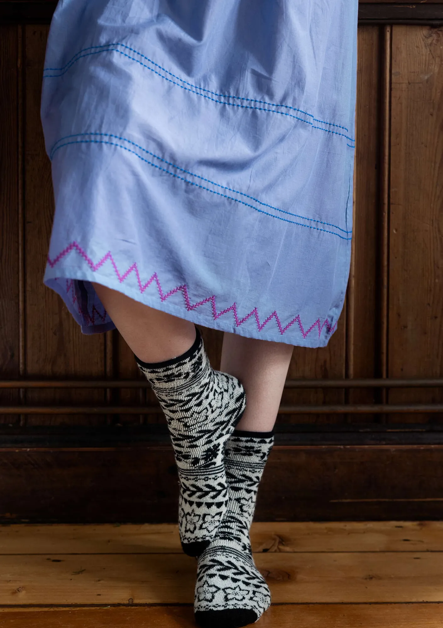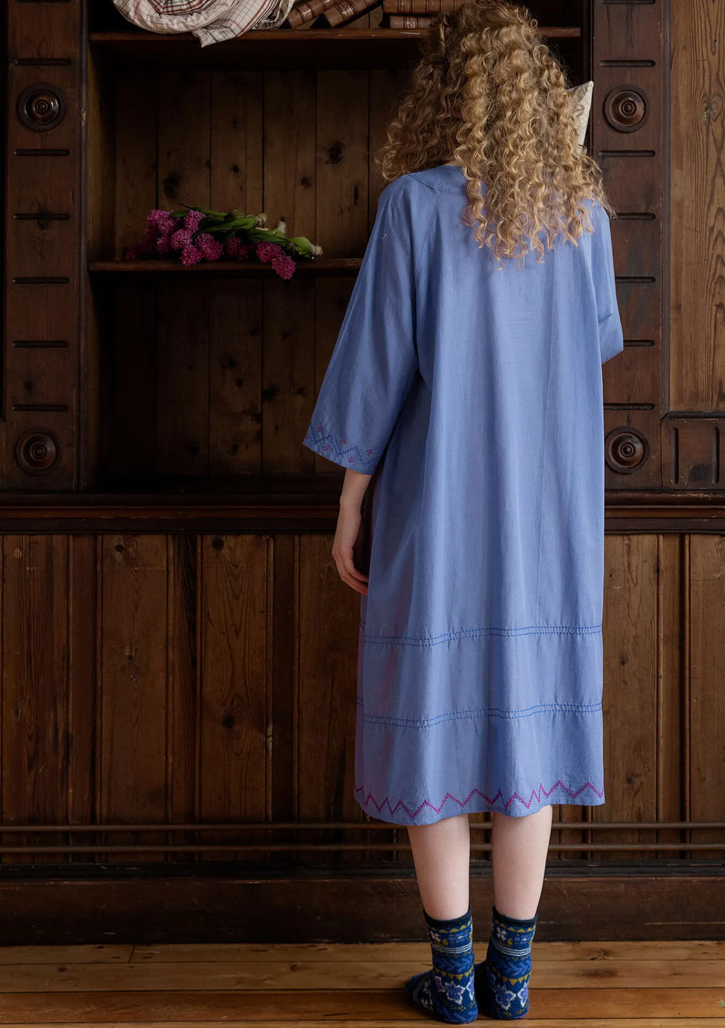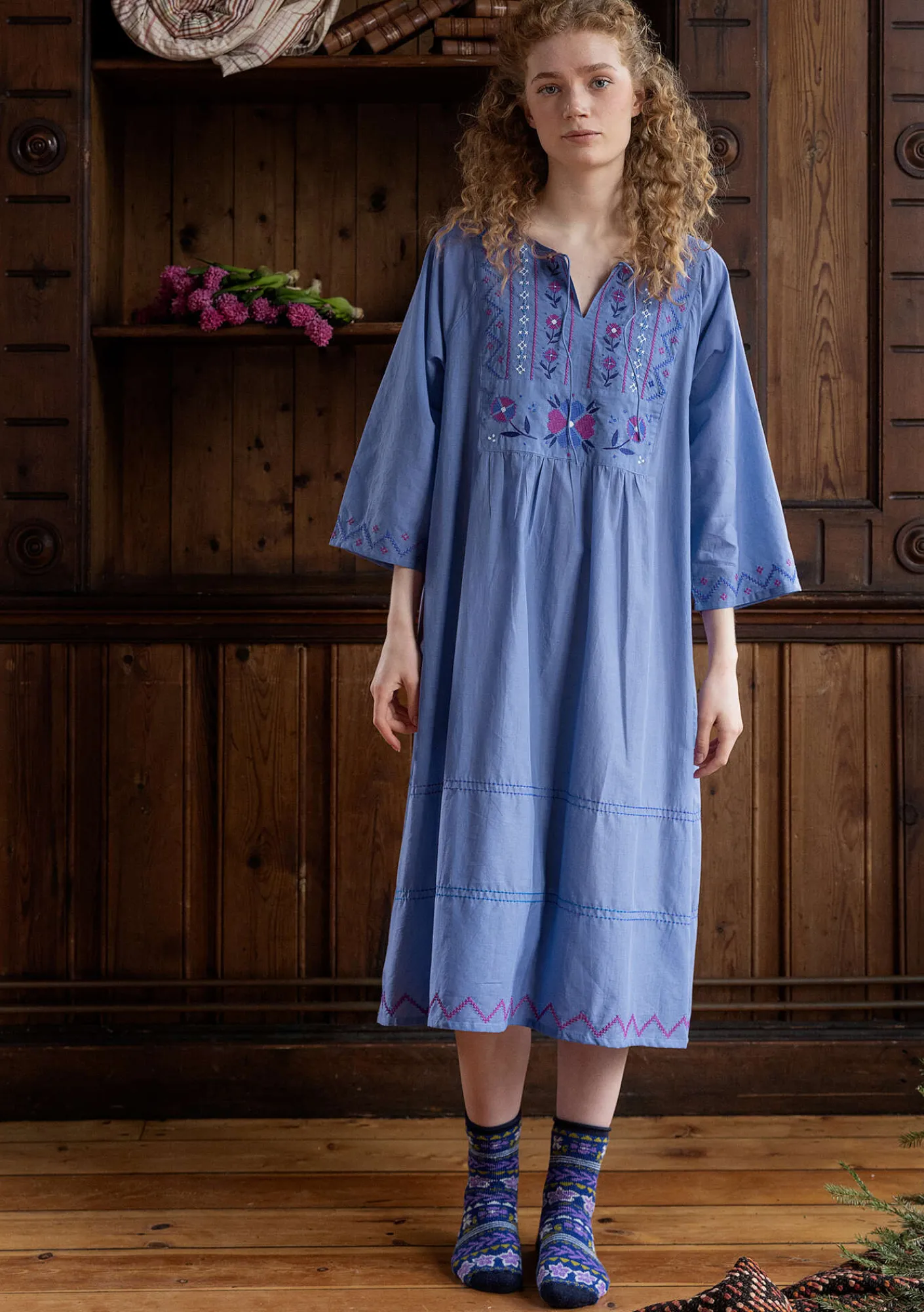 Vävt nattlinne med trekvartslång ärm och ett rikt dekorerat bystparti. Rund halsringning med ett litet sprund och knytband mitt fram. Broderier som ramar in vid ärmslut och vid plaggets nederkant.
