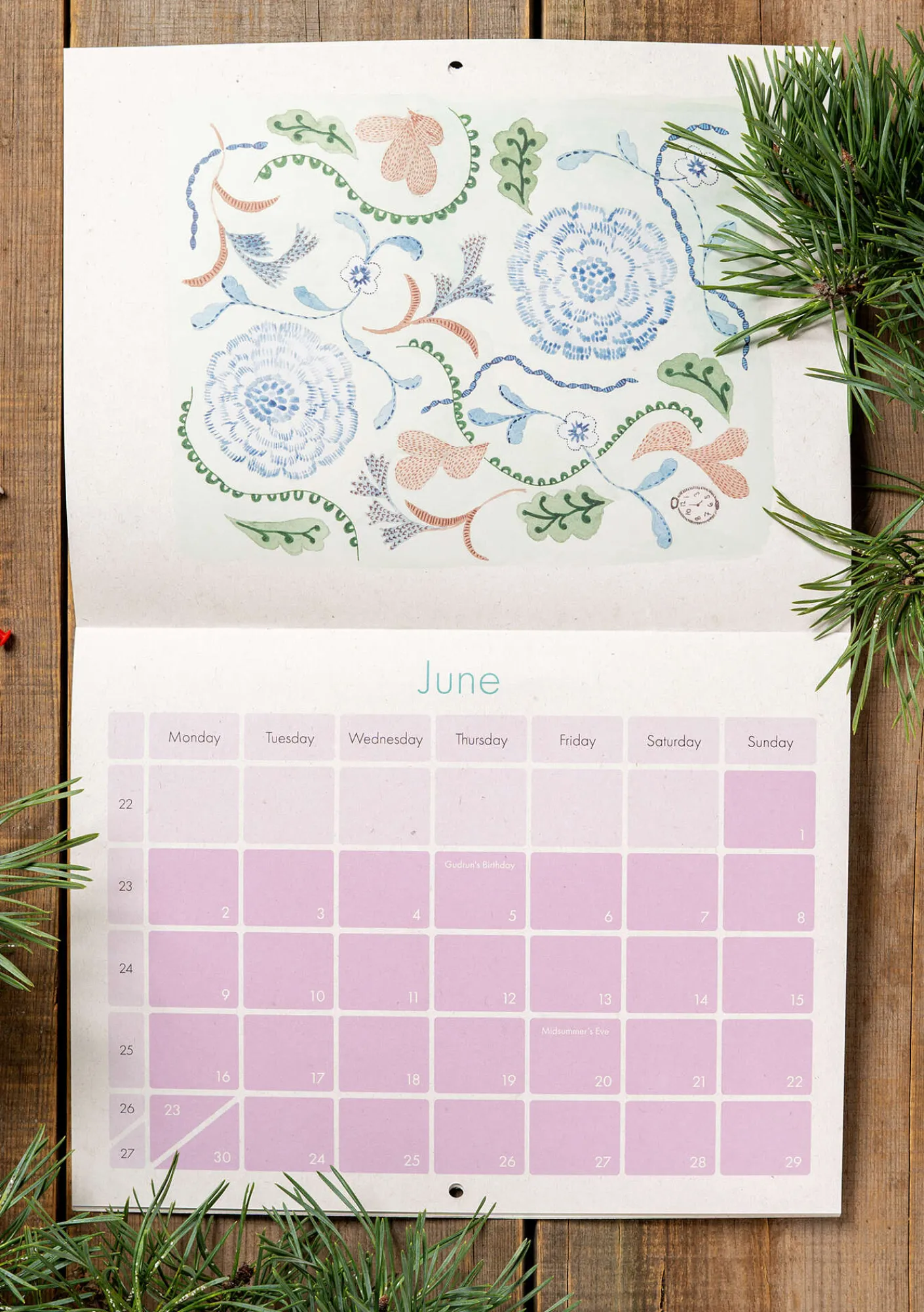 En kalender fylld med Gudruns inspirerande akvareller och mönster att pryda väggen med. Datumrutor med plats för aktiviteter och ”kom ihåg”. En fin present till dig själv och dina vänner.