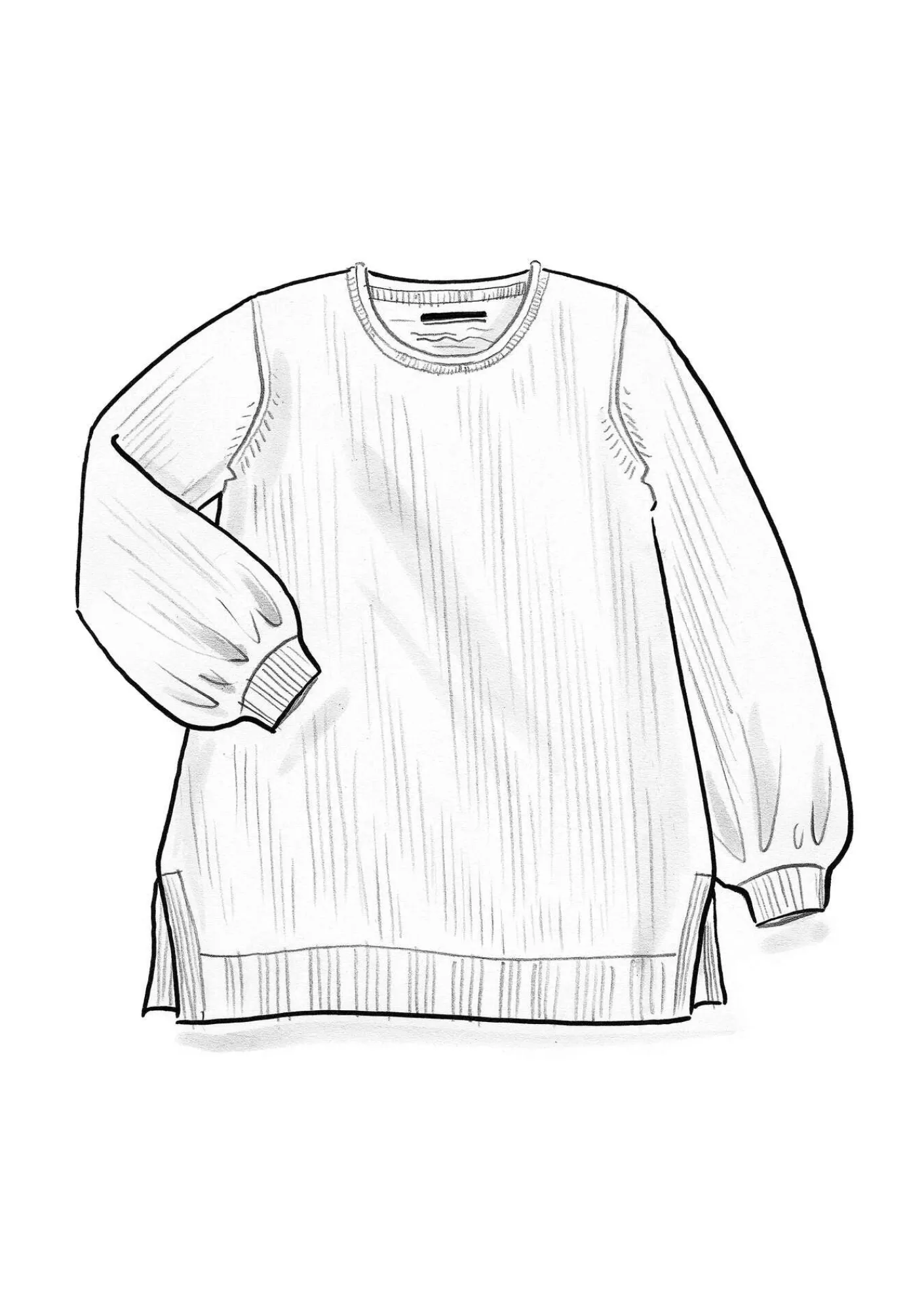 Slätstickad tunika i mjuk alpackamix med sidslitsar. Helång ärm med puff nedtill och rund halsringning med rullkant. Ribbstickad vid ärmslut och i nederkant.