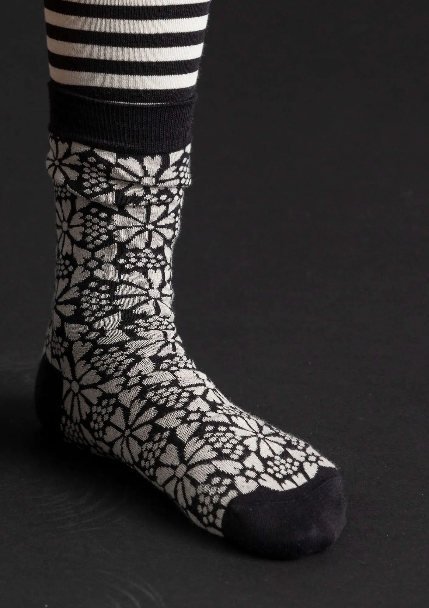 Grafiskt folkloristiska blomster pryder denna lilla strumpa. Bekväm och mjuk ribb upptill.
