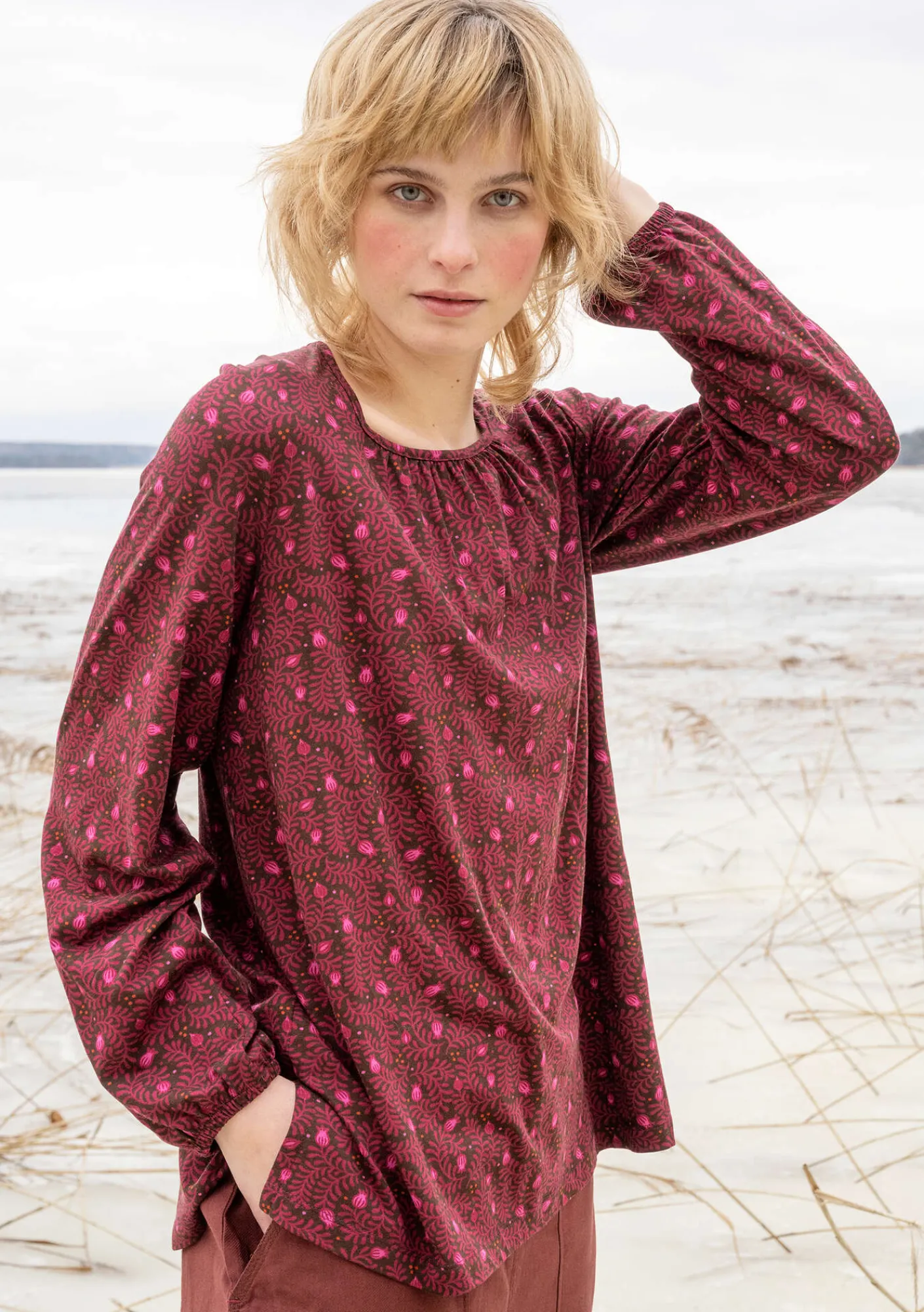 Tryckt, småmönstrad trikåblus i en något utställd modell. Hellång ärm som har en liten puff i nedtill. Mjukt formad fyrkantsringning i halsen med rynkning framtill.