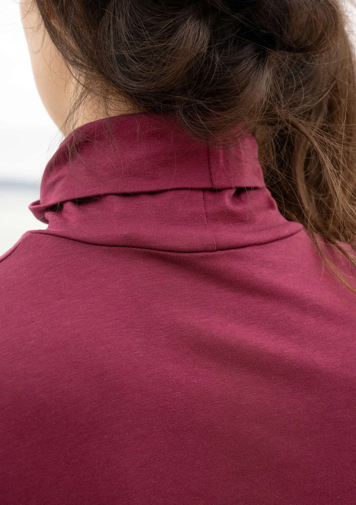 Enfärgad trikåtunika i en A-formad modell med polokrage samt fickor i sidsömmen. Muddar vid ärmsluten som går att vika upp.