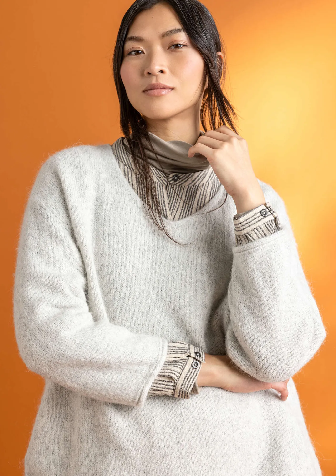 V-ringad tröja i en aningen lösare modell för mysiga dagar. Stickad i vårt fina melangegarn med små slitsar i sidorna. Ärmarna och nederkanten avslutas med en liten rullkant.