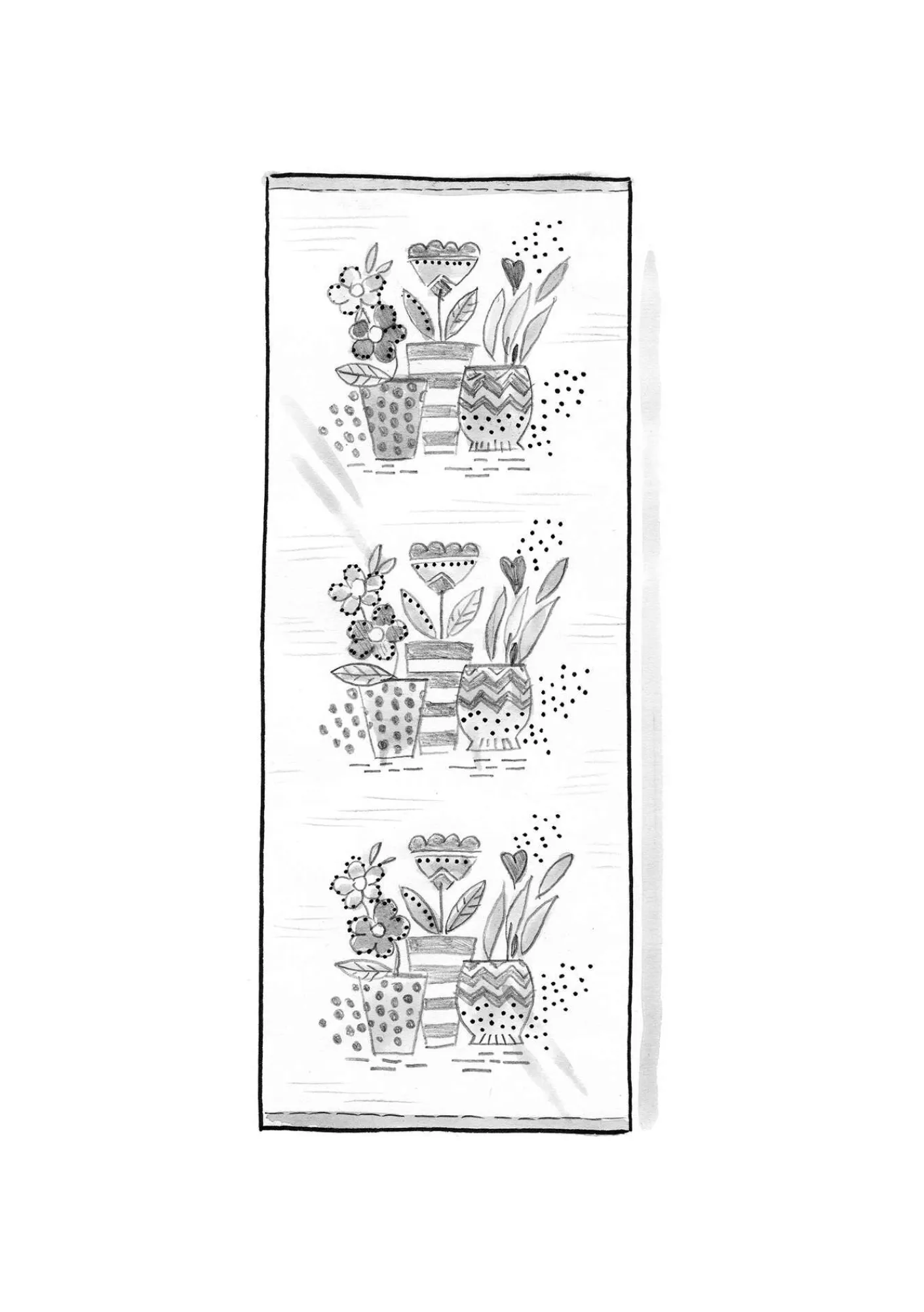 Vävd med screentryckt på prunkande blomkrukor samt enfärgade kanter.