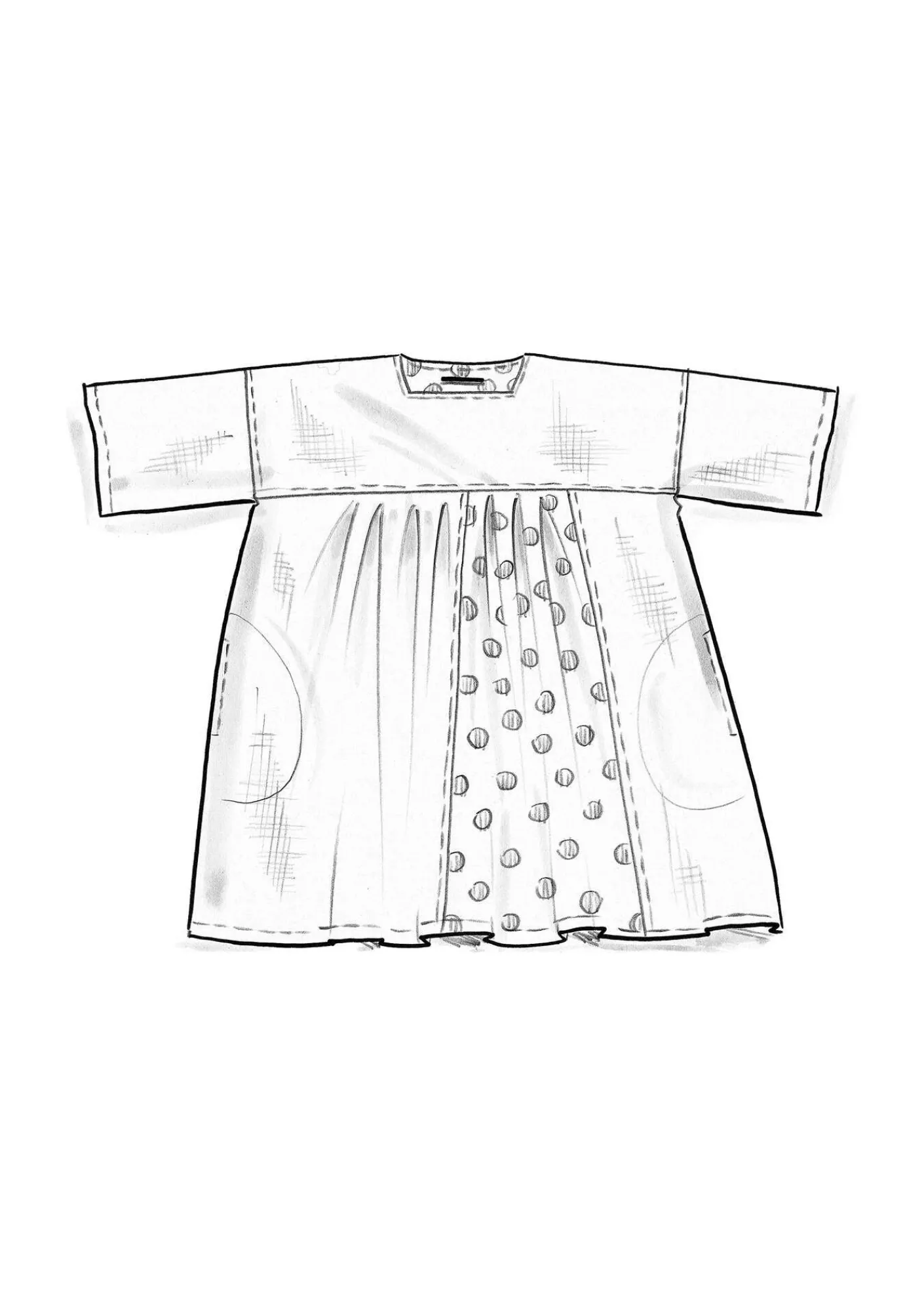 Tunika i en avskuren modell där den övre delen är sydd i en något grövre kvalitet. Mycket vidd och rynkning upptill, på både fram- och bakstycke. Fyrkantig halsringning och med en liten knapp. Ett avvikande tryckt parti framtill samt på insidan av nacken. En lite kortare trekvartslång ärm.