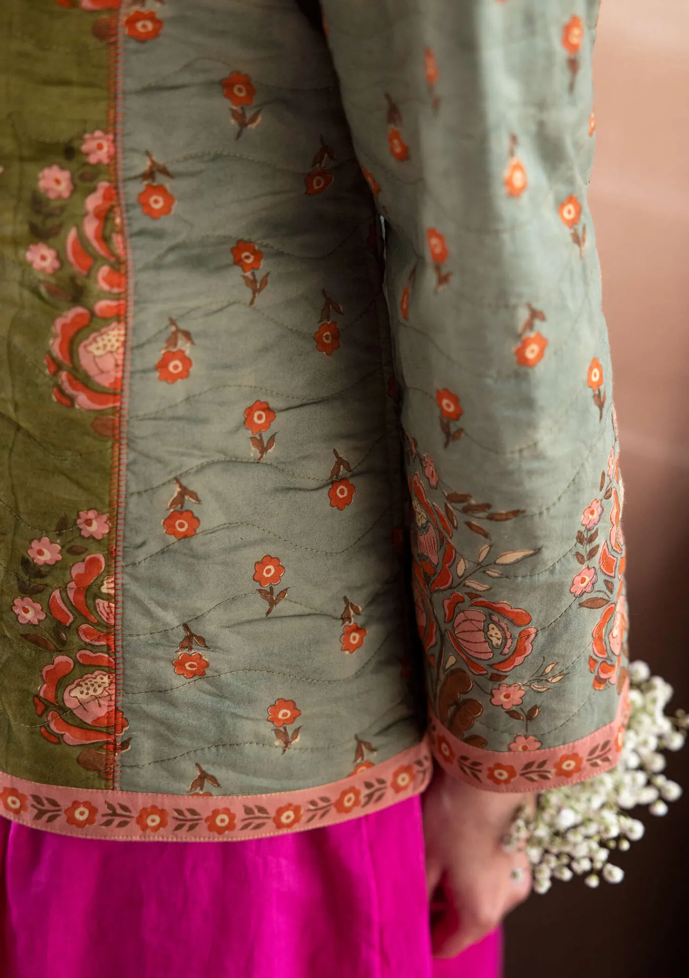 Blocktryckt jacka i en vändbar, rak modell med hellång ärm. Kviltad med ett tunt lager bomullsflanell. Sidfickor och en utanpåficka. Fint arbetad med en broderad blomma på ryggen. Knäpps med textila kinaknappar, i klassisk modell.