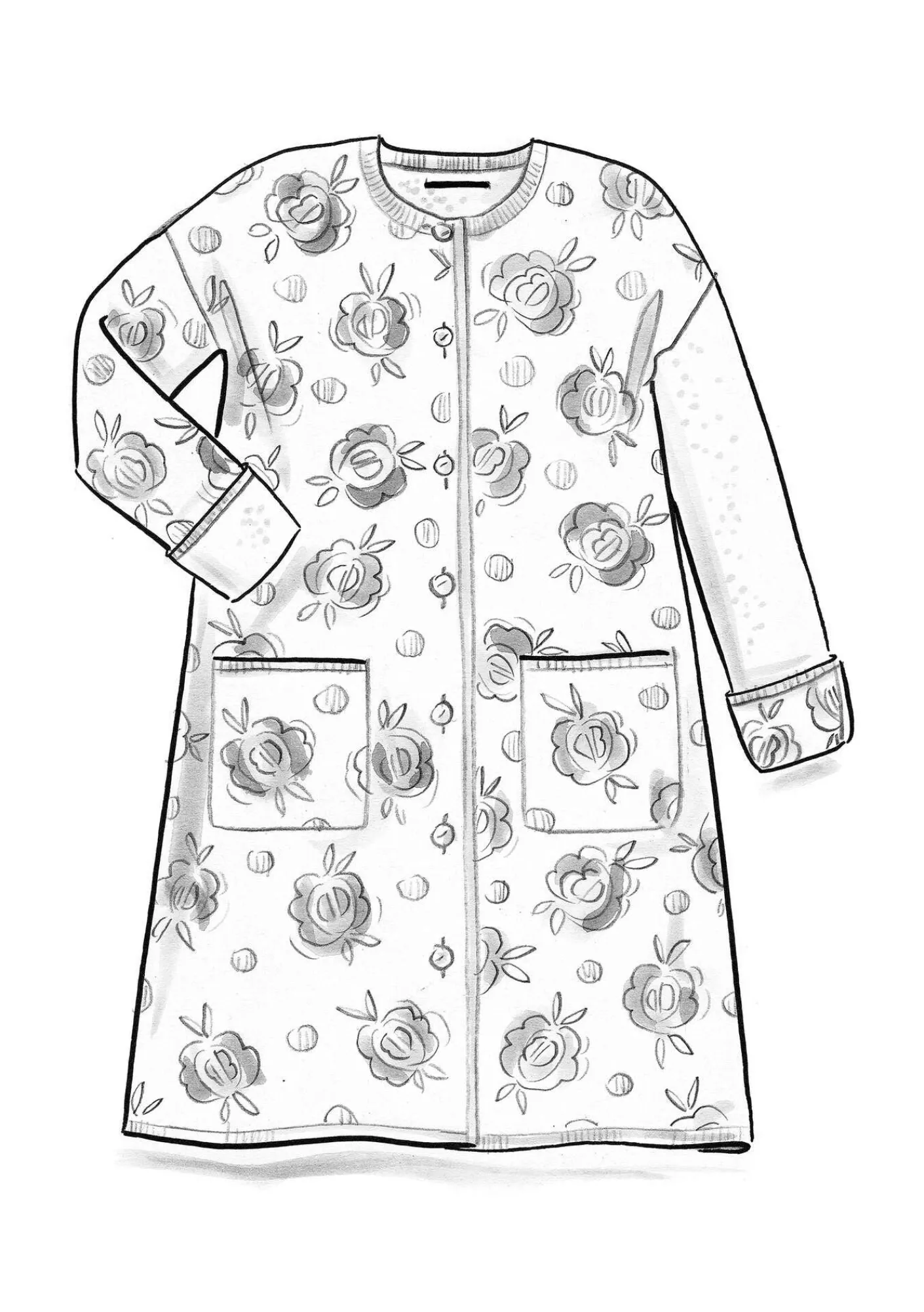Vändbar, jacquardstickad kappa i filtad ekologisk ull. Ena sidan rosmönstrad och andra enfärgad med melangeffekt. En avvikande ärm där sidorna är omvända. Modell med nedhasad ärm och en rund halsringning. Två utanpåfickor på varje sida av kappan.