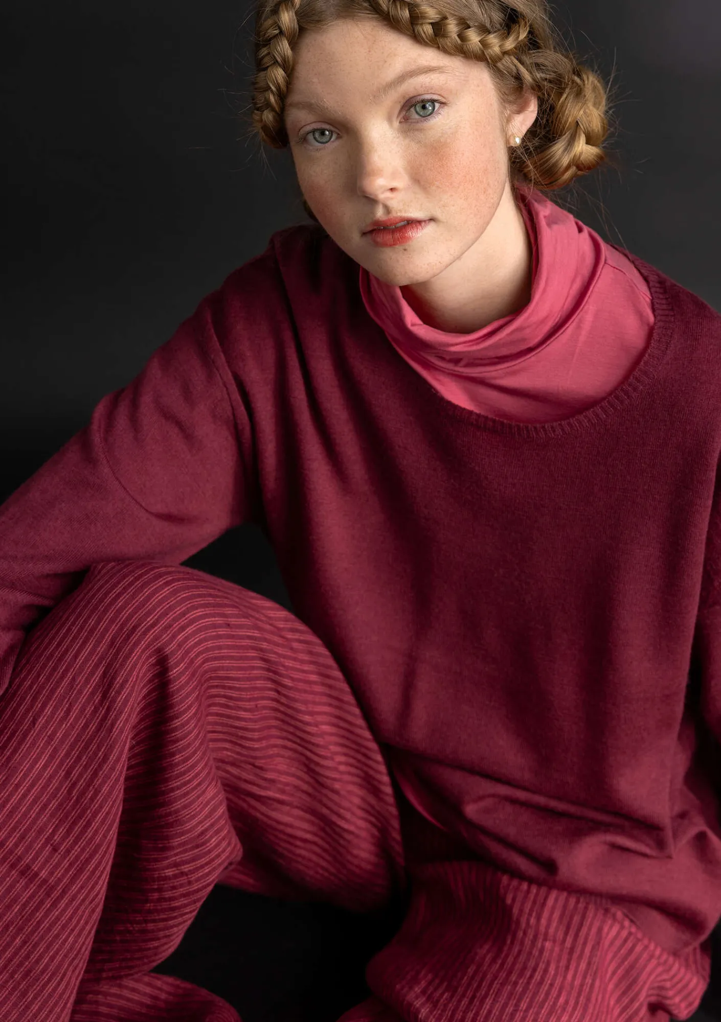 Byxa i linnetyg, med snyggt fall. Finns i enfärgat och med en garnfärgad rand. Hellång modell, med enkel resår i midjan. Raka, vida byxben och praktiska sidfickor.