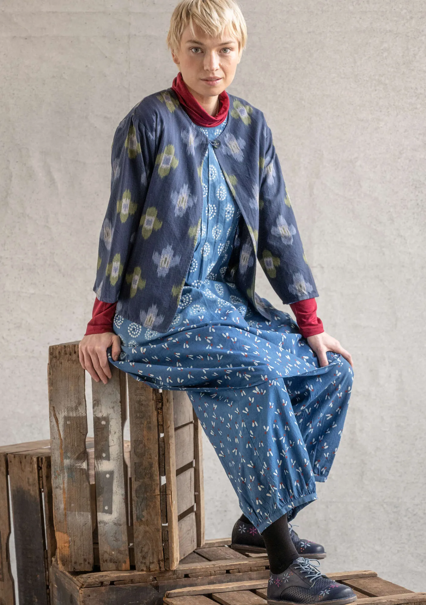 Ikatvävd jacka i en blommig mönstring. Lätt utställd modell med rund halsringning och trekvartslång ärm. Knäpps med en enkel tygklädd knapp.
