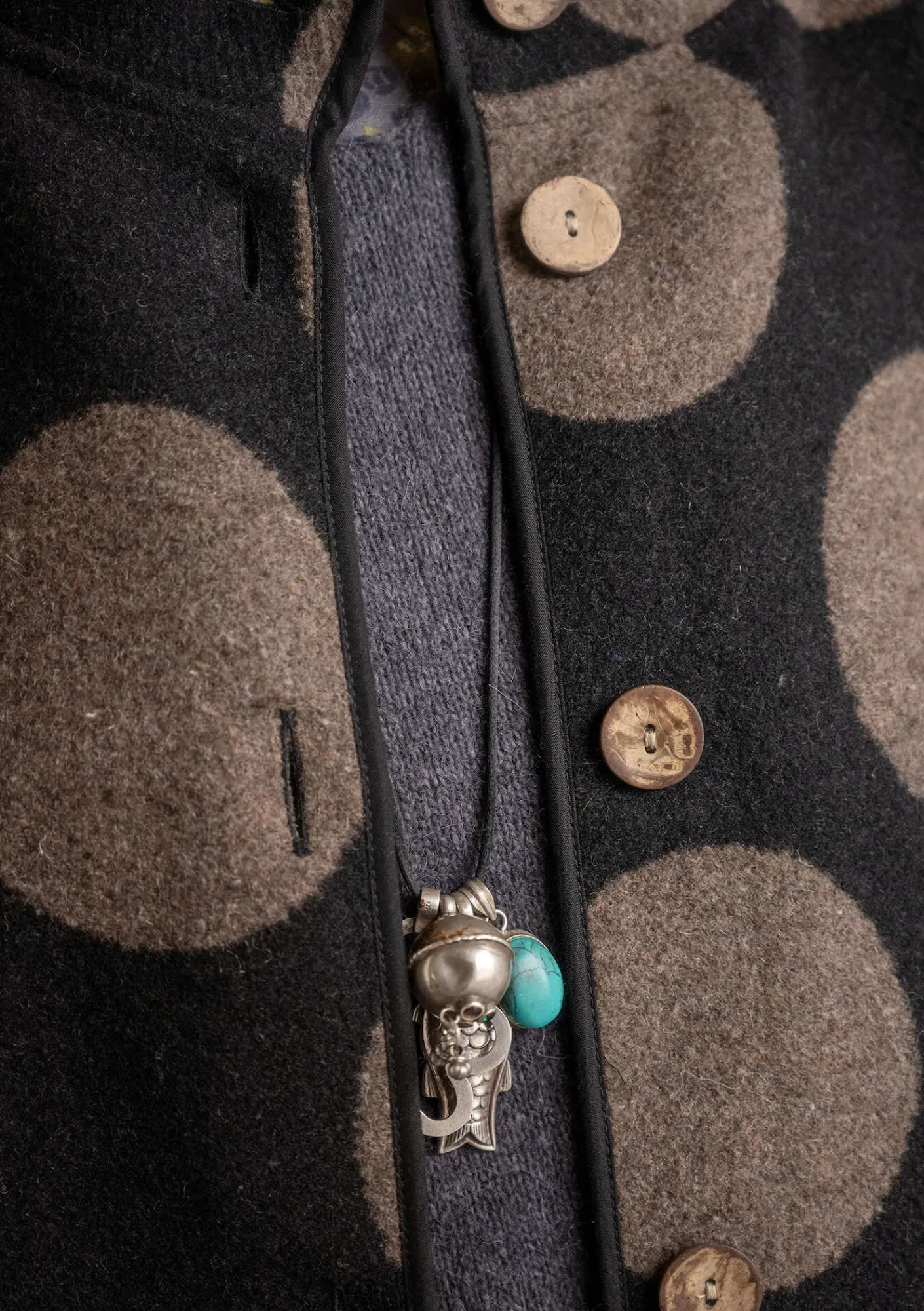 Jacquardvävd kappa med stora härliga prickar. Bandkantad modell med hellång raglanskuren ärm, hög krage och utanpåfickor. Knappar i naturfärgad kokos.