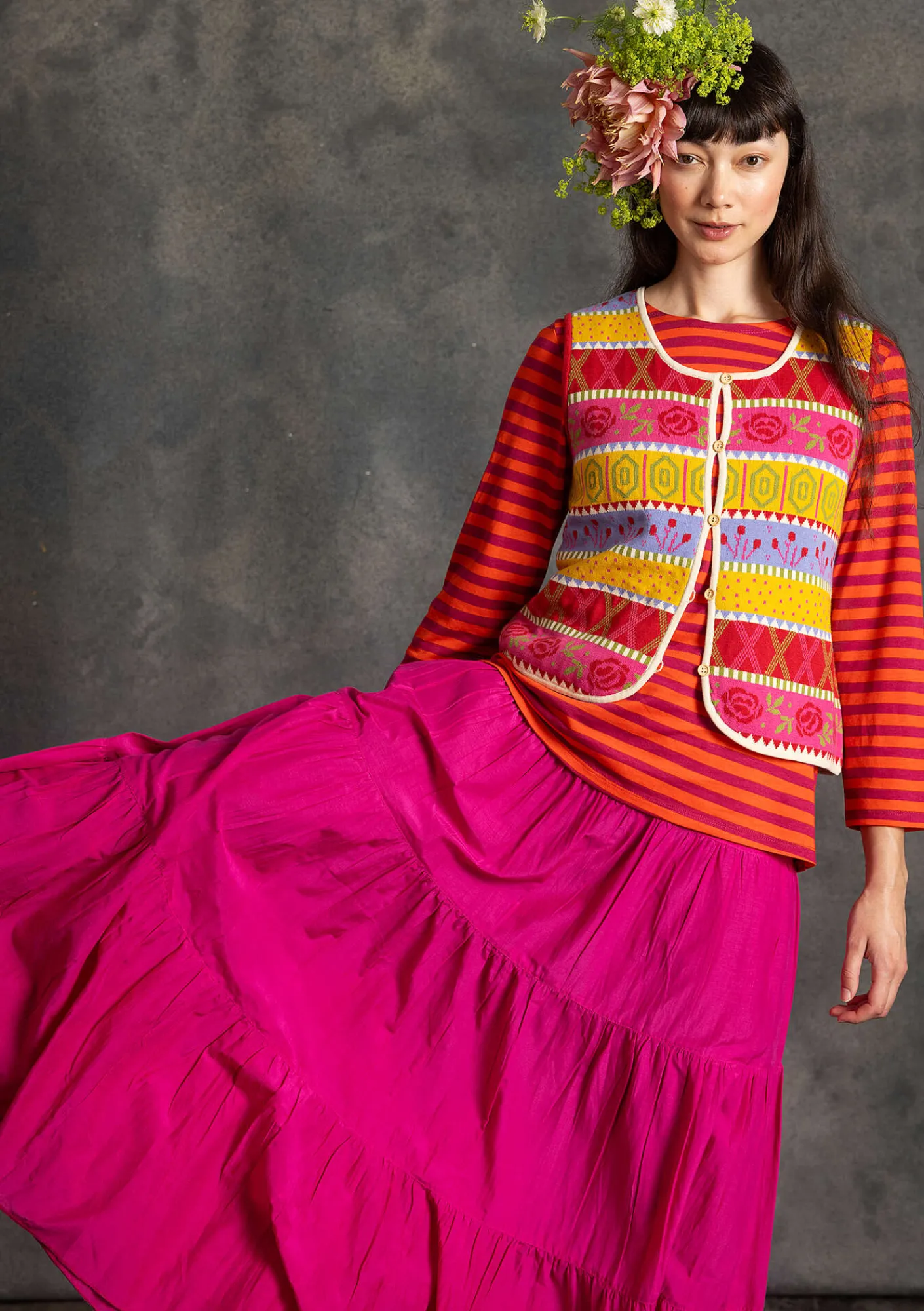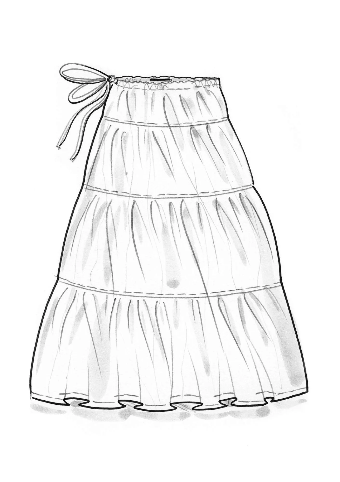Kjol i härlig siden/bomullsväv med fint fall och mycket vidd. Fin modell sydd i fyra våder, dragsko samt bekväm resår i midjan.