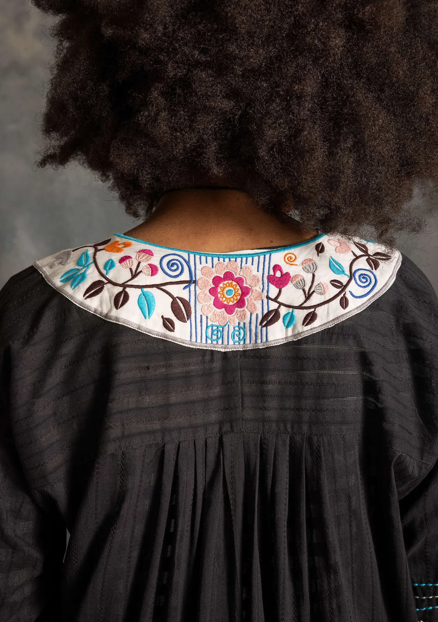 Rikt dekorerad klänning med vackra bårder, blomsterbroderat ok och fyrkantig halsringning. Rynkad under bysten, vilket ger en härlig vidd nedtill och gör modellen lättburen. Lite längre trekvartslång ärm som är fint utsmyckad med avskärning med nedsydda veck, påsydda band och broderi.