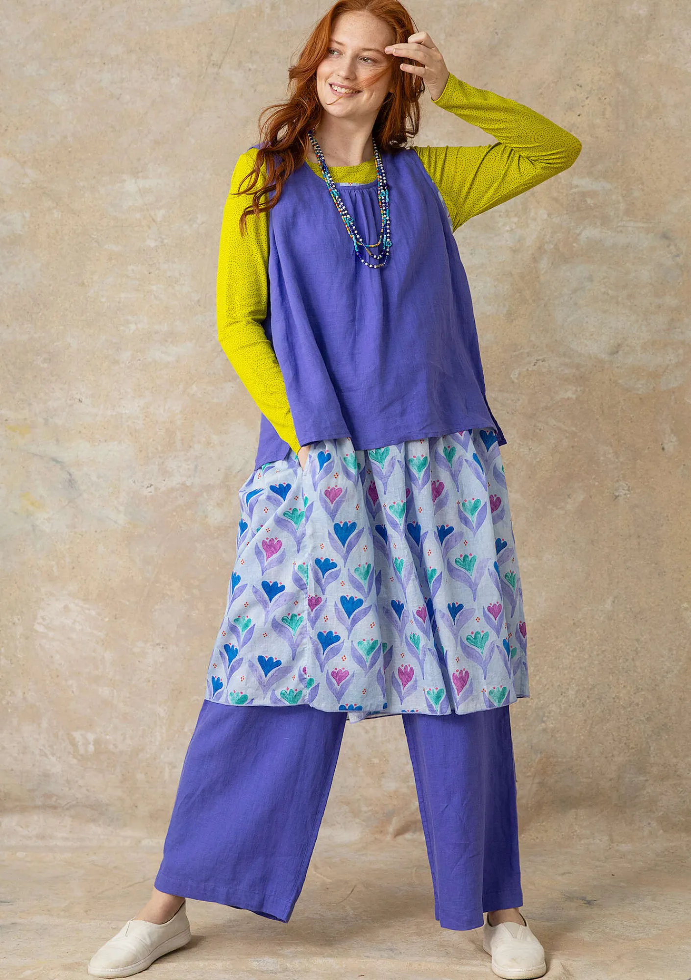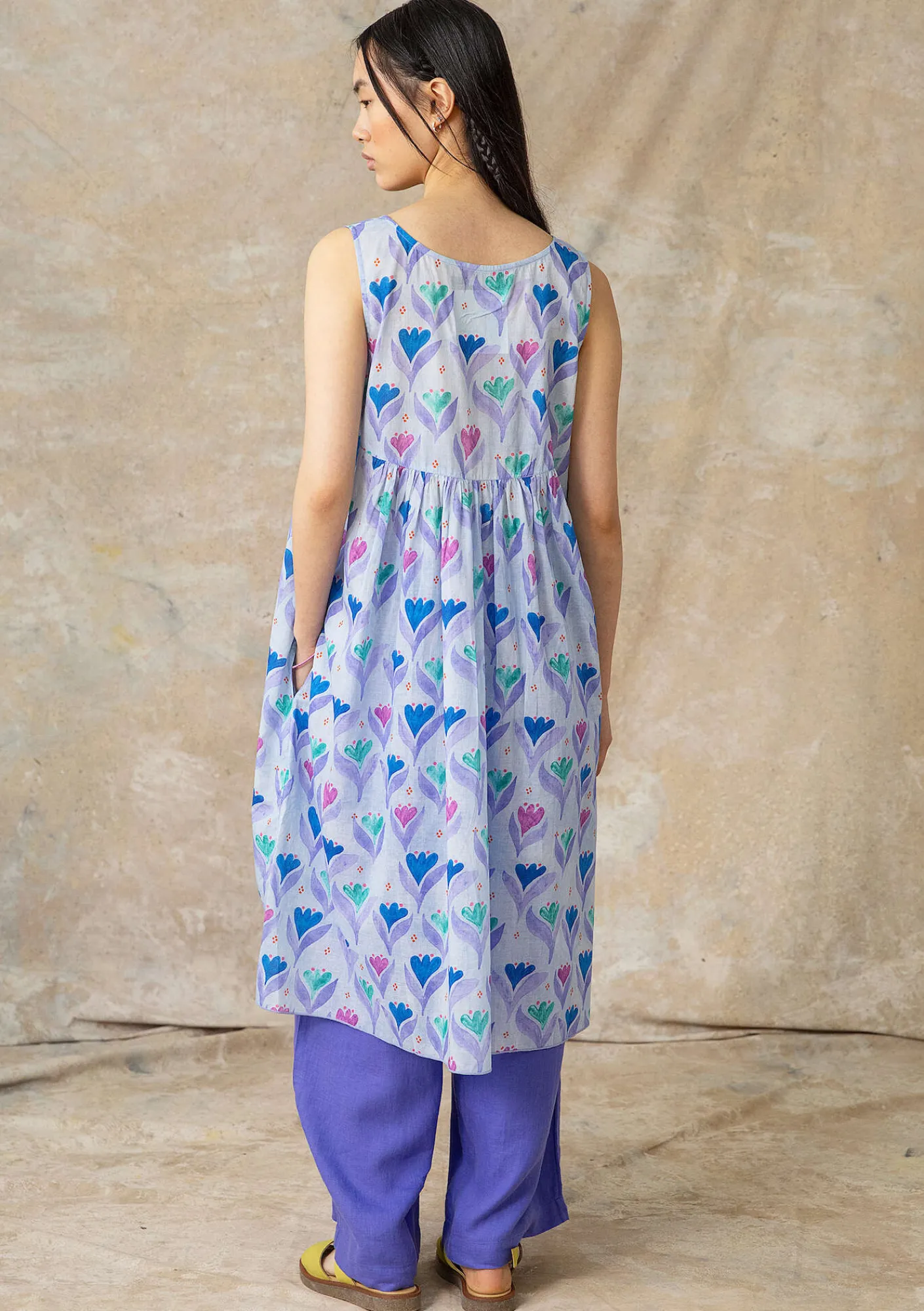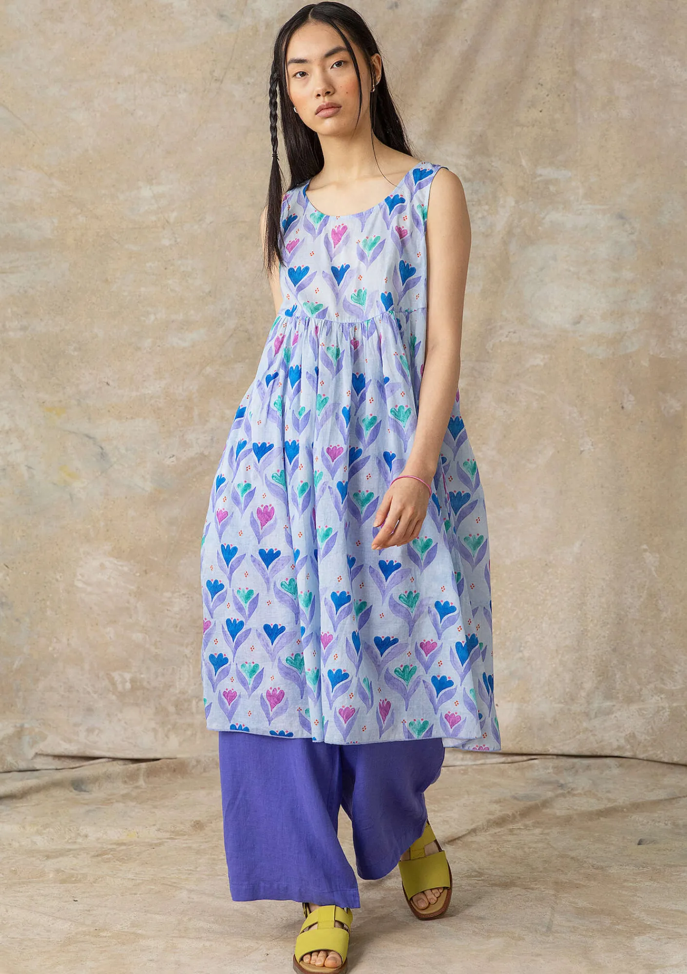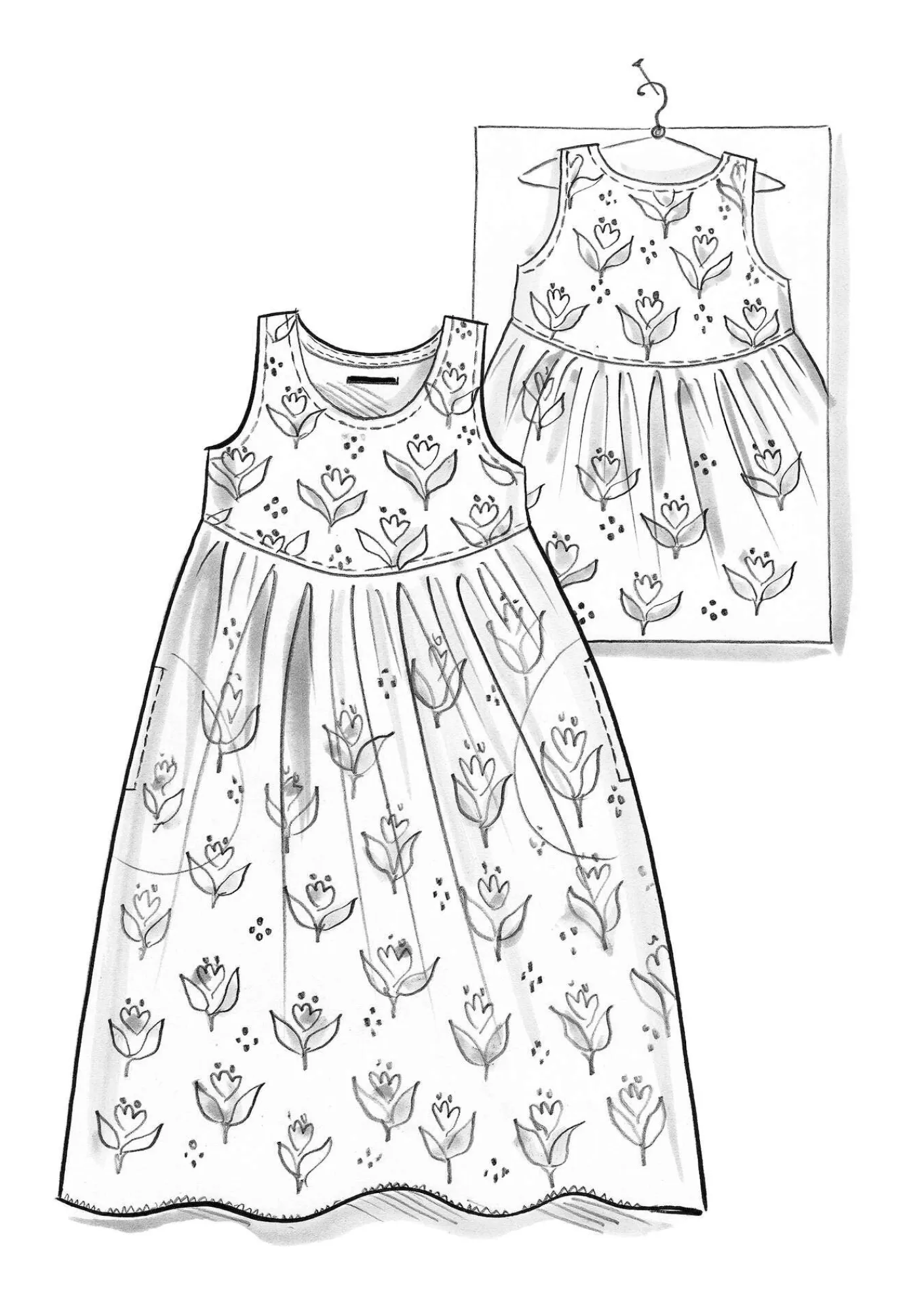 Ärmlös klänning med sidfickor samt ett ok med rynkning på både fram- och bakstycke. Alla färgställningar har olika digitaltryckta mönster med akvarellmålade blommor.