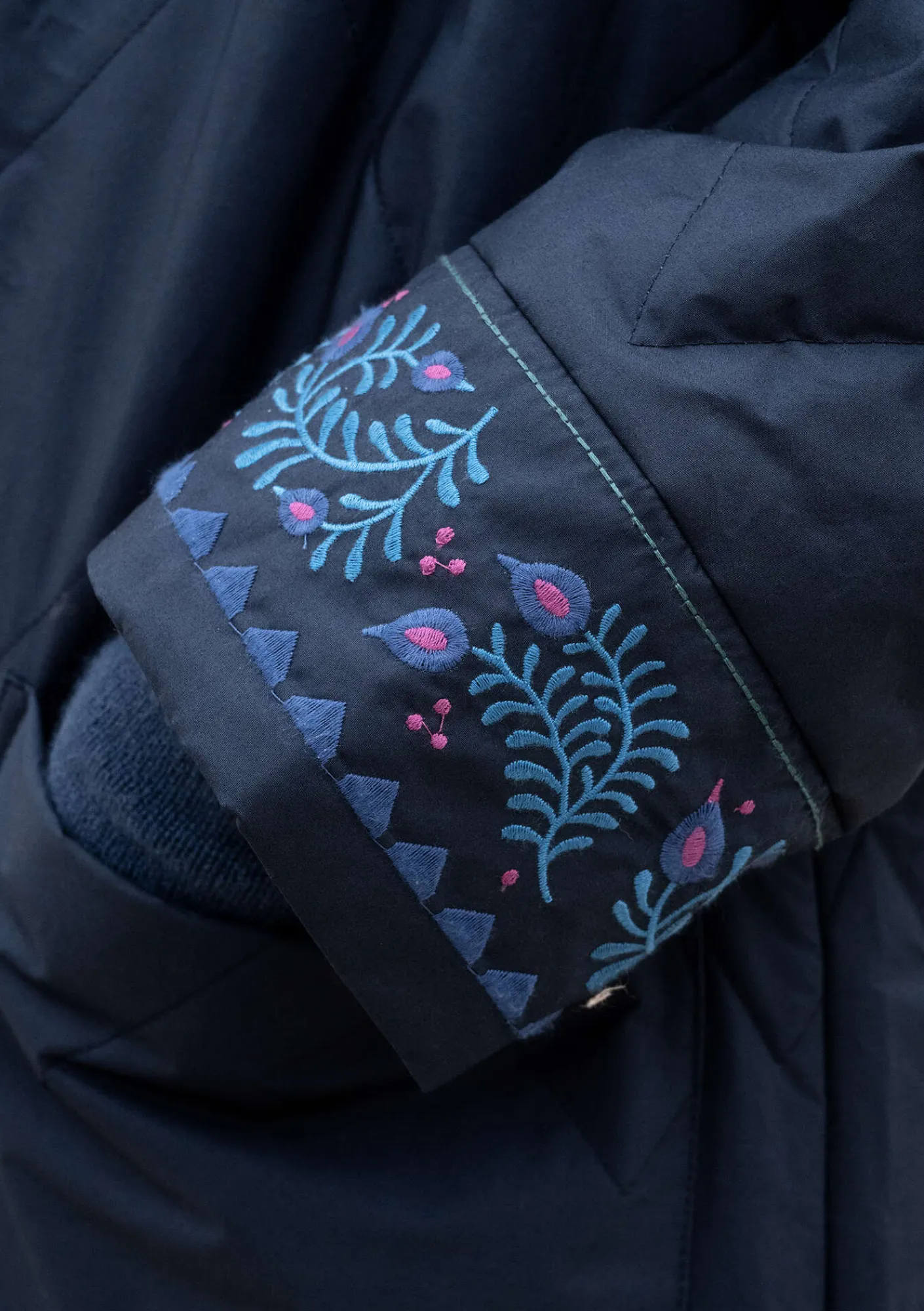 Kviltad, helfodrad kappa i en modell med hellång ärm och sidslitsar som kan knäppas igen med tryckknappar. Dold dragkedja samt en knappslå mitt fram. Rymliga fickor och en dold mudd i ärmen. Dekorativa broderier vid ärmslut, hals och runt huva.