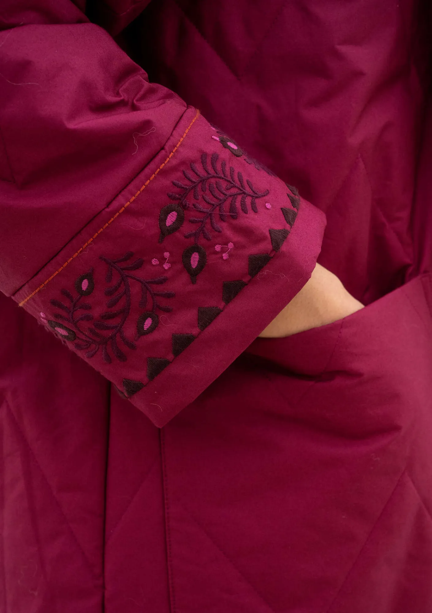 Kviltad, helfodrad kappa i en modell med hellång ärm och sidslitsar som kan knäppas igen med tryckknappar. Dold dragkedja samt en knappslå mitt fram. Rymliga fickor och en dold mudd i ärmen. Dekorativa broderier vid ärmslut, hals och runt huva.