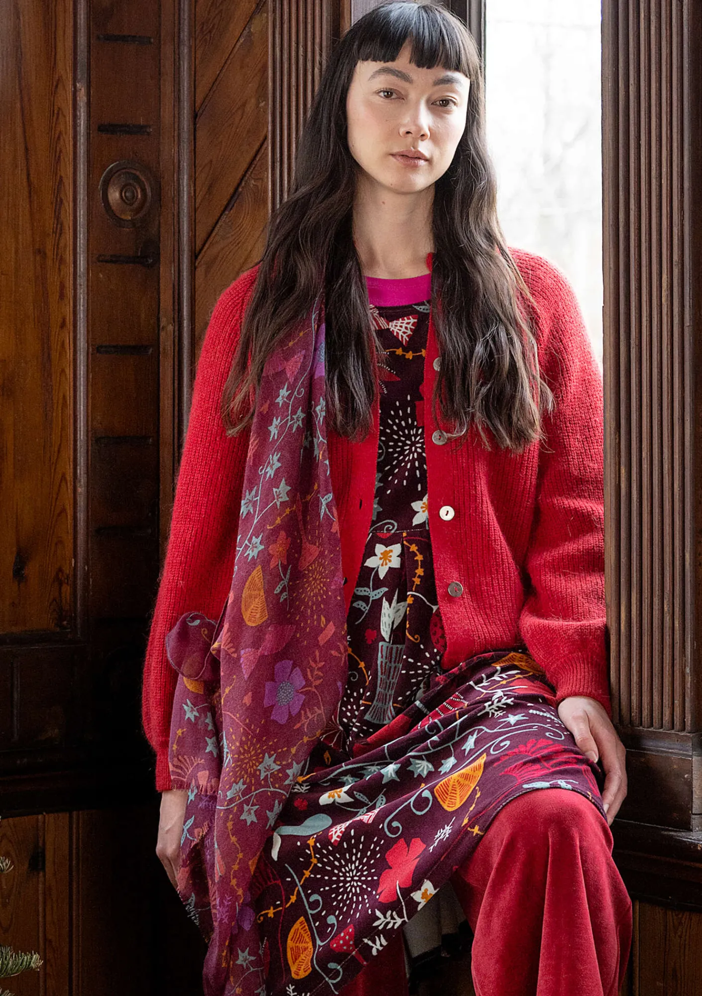 Tryckt ullsjal, med placerat mönster, i en rik mönsterbild. Fållad långsida med tråd i accentfärg. Ofållad kortsida som ger en kort och naturlig frans.
