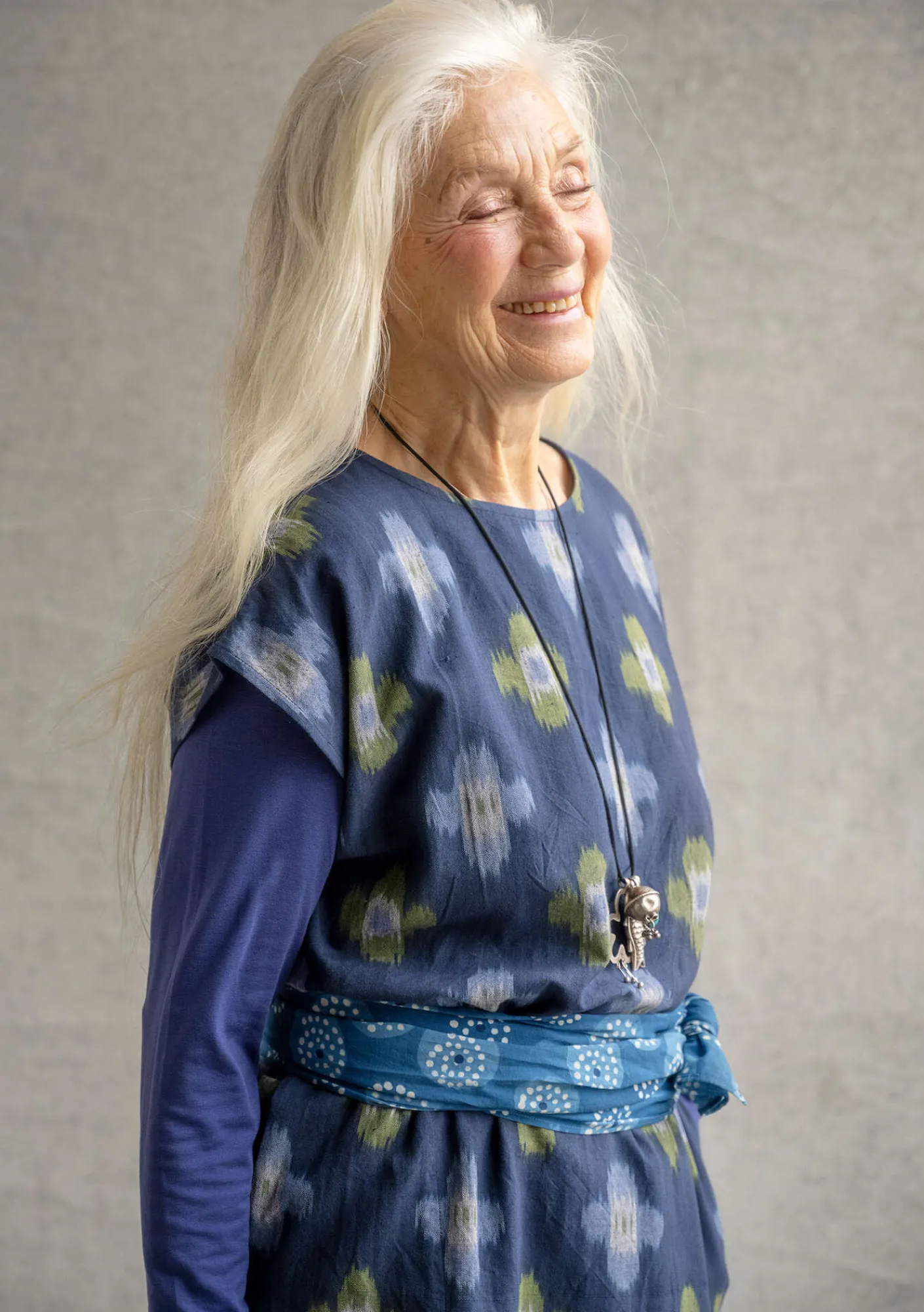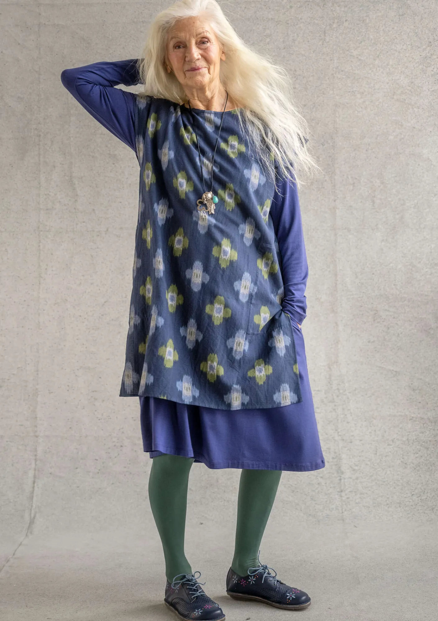 Ikatvävd tunika i en rak modell med holkärm och höga sidslitsar. Rund halsringning och rektangulära sidfickor.