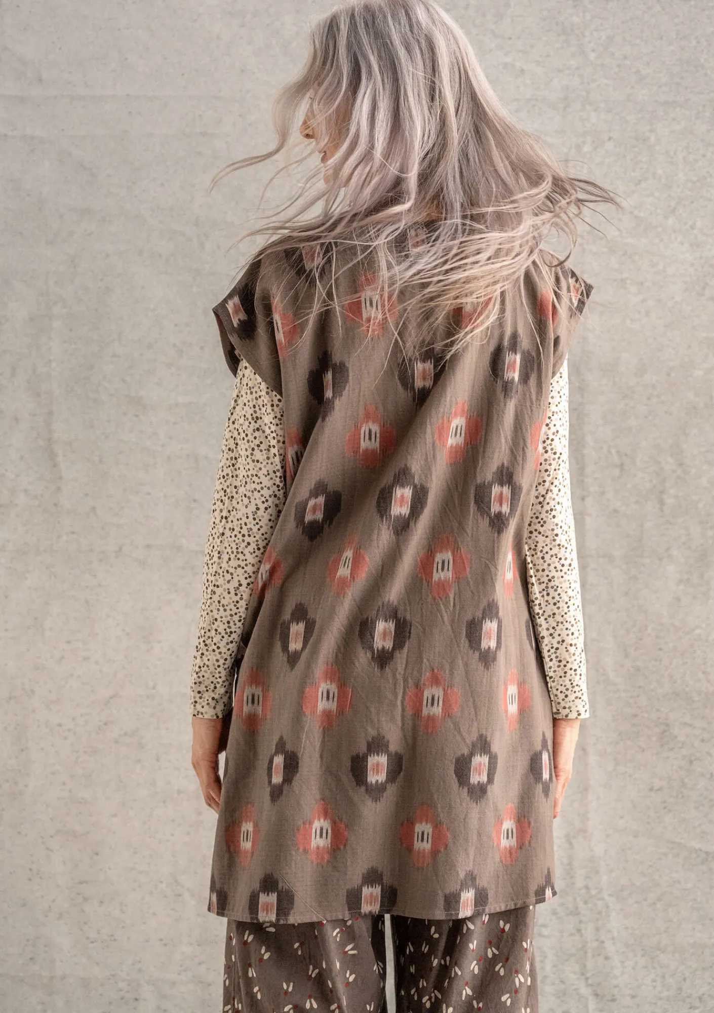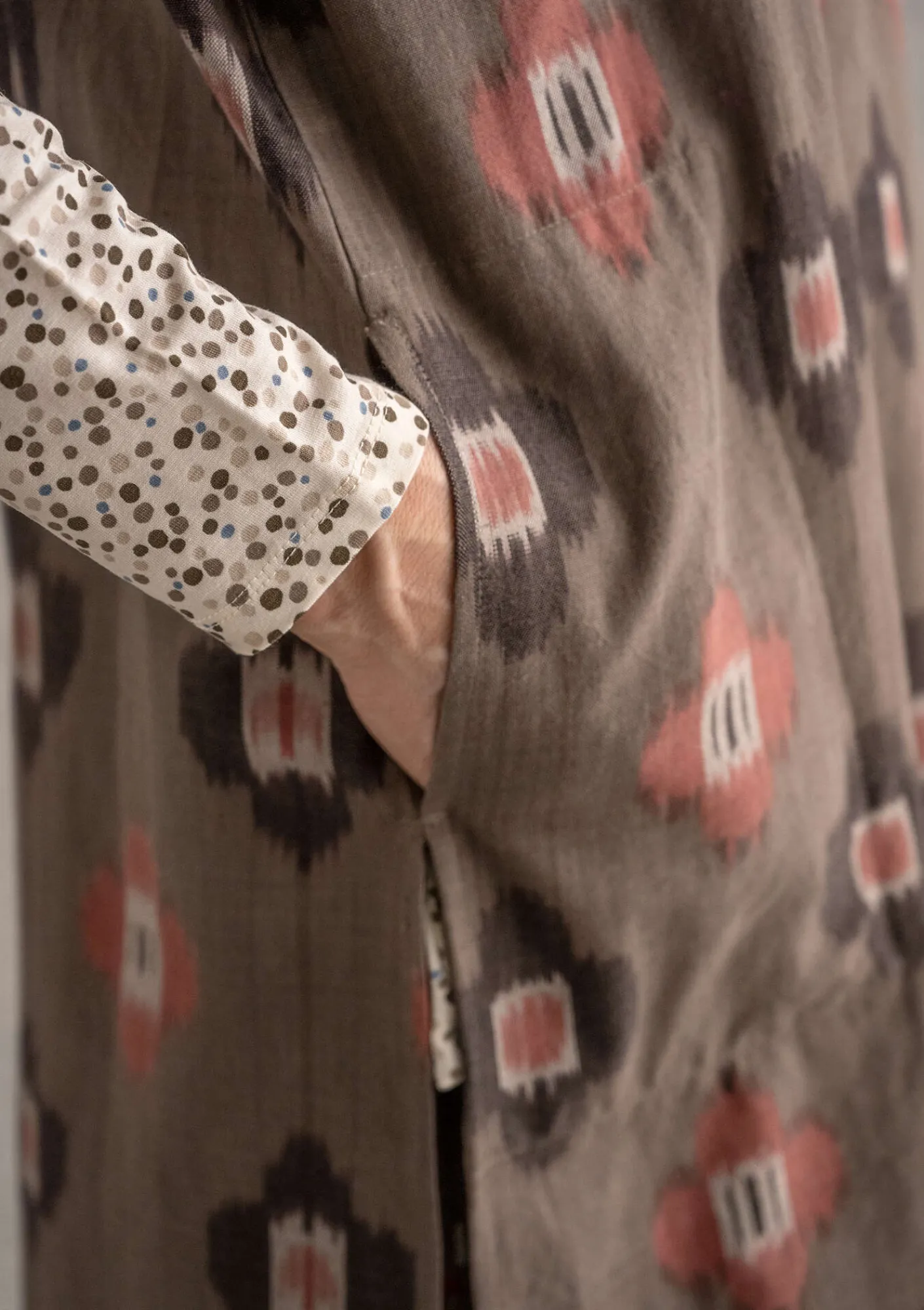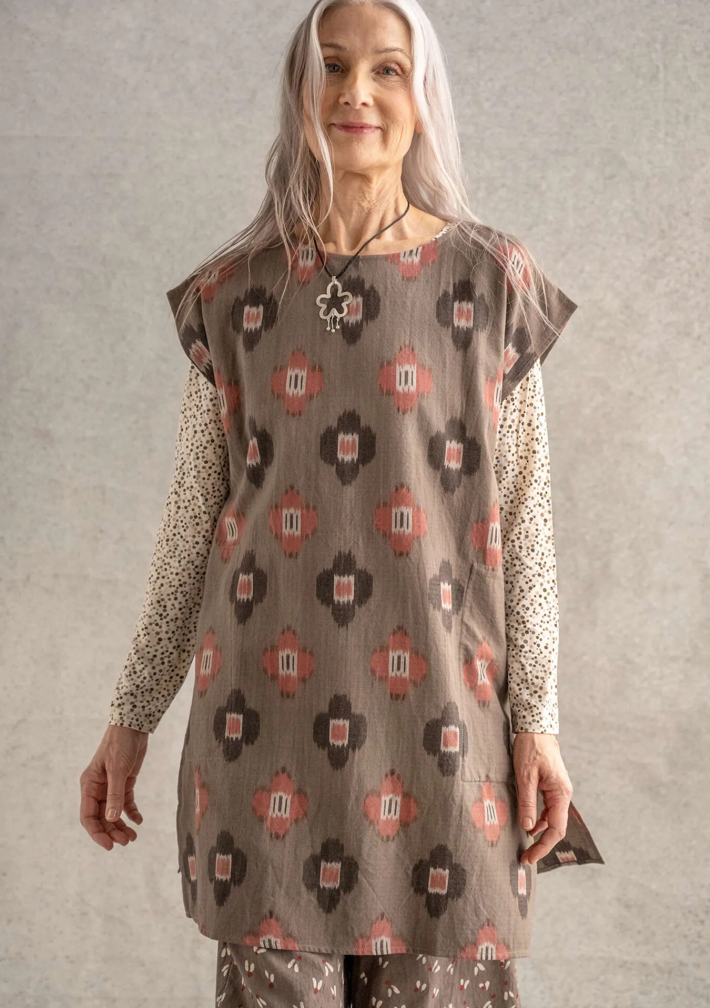 Ikatvävd tunika i en rak modell med holkärm och höga sidslitsar. Rund halsringning och rektangulära sidfickor.