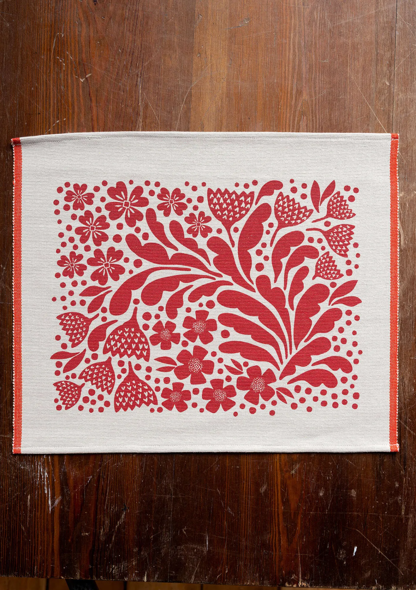 Bordstablett i tät ripsväv smyckad med tryckta blommor som frodigt breder ut sig. Vackert ackompanjerat med vävda kanter i accentfärg.