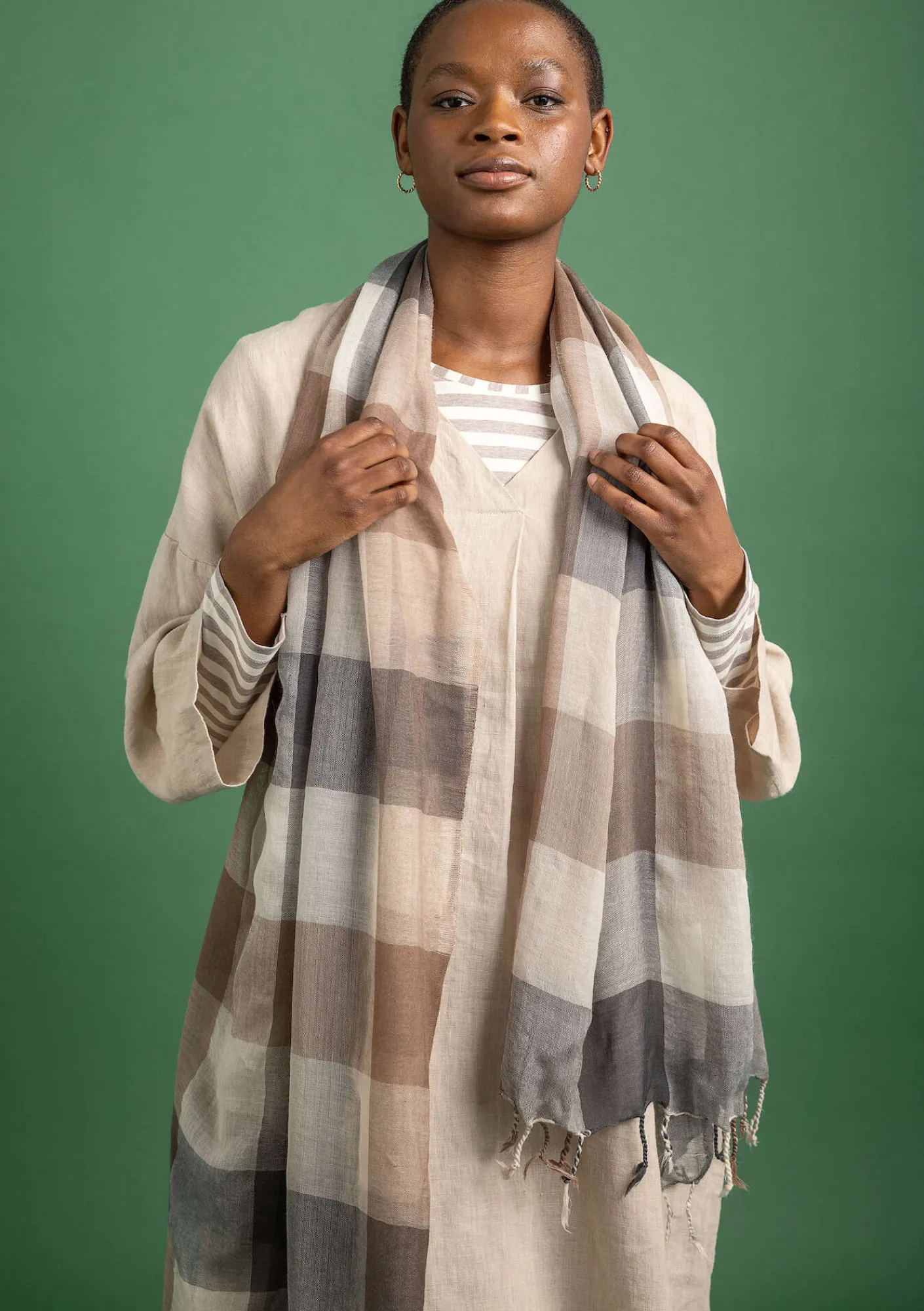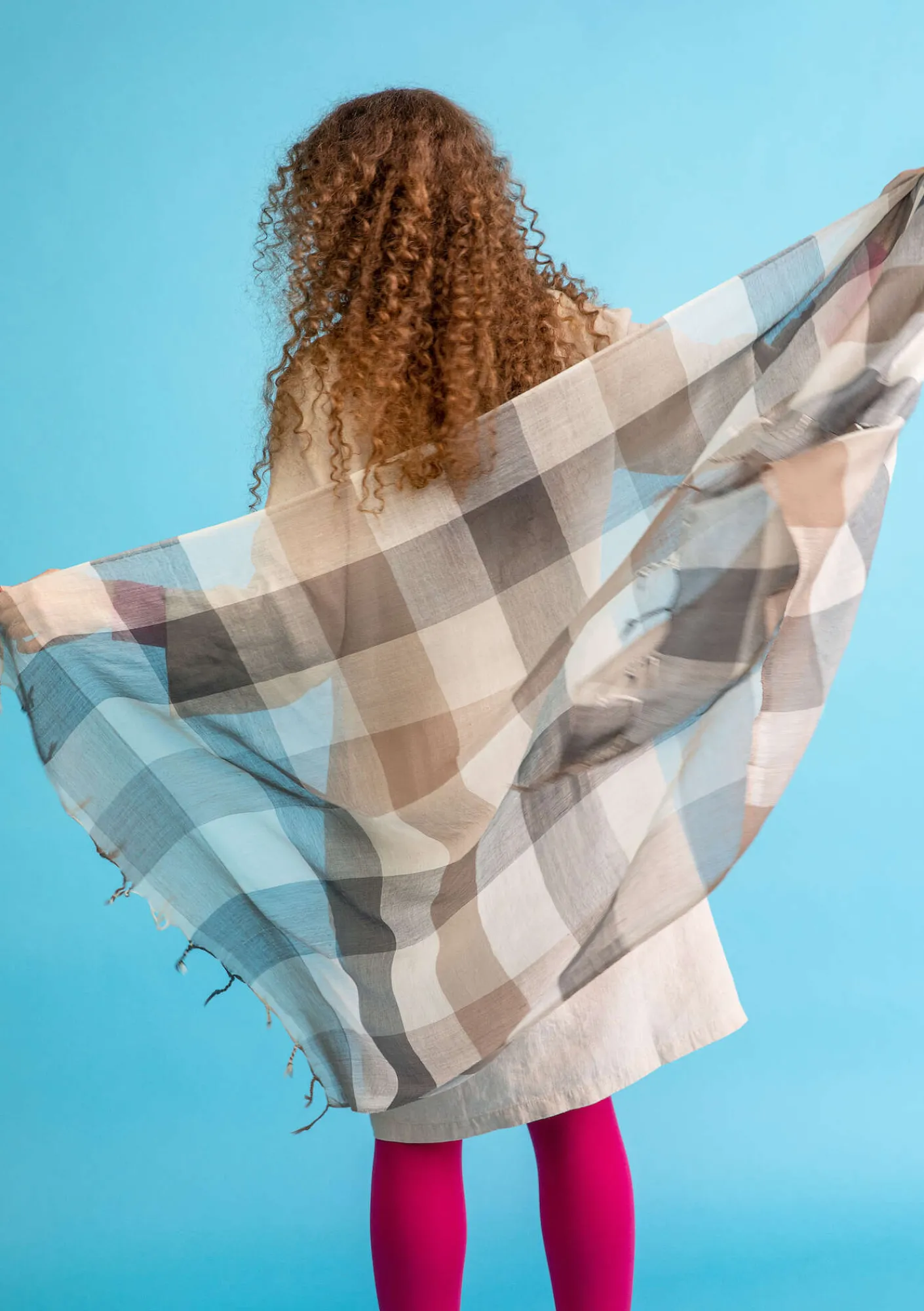 Vår värmande ullsjal i mjuk kvalitet. Pryds av en garnfärgad ruta i oemotståndliga färgställningar. Fransar i kortsidorna.