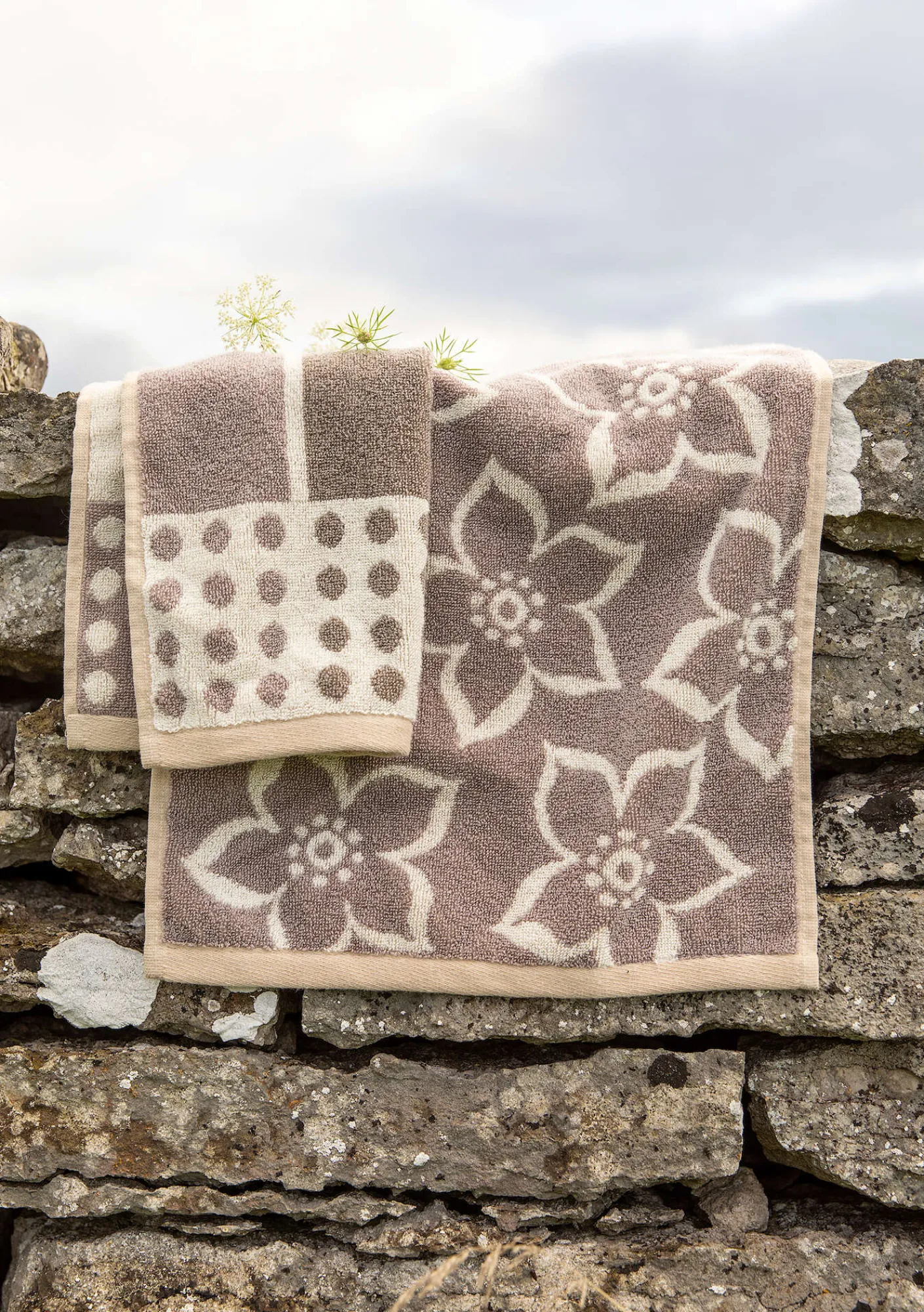 Gästhandduk i tvåpack med mönsterbilder av blommor och ränder. Kontrastfärgad kant och hängare på kortsidan.