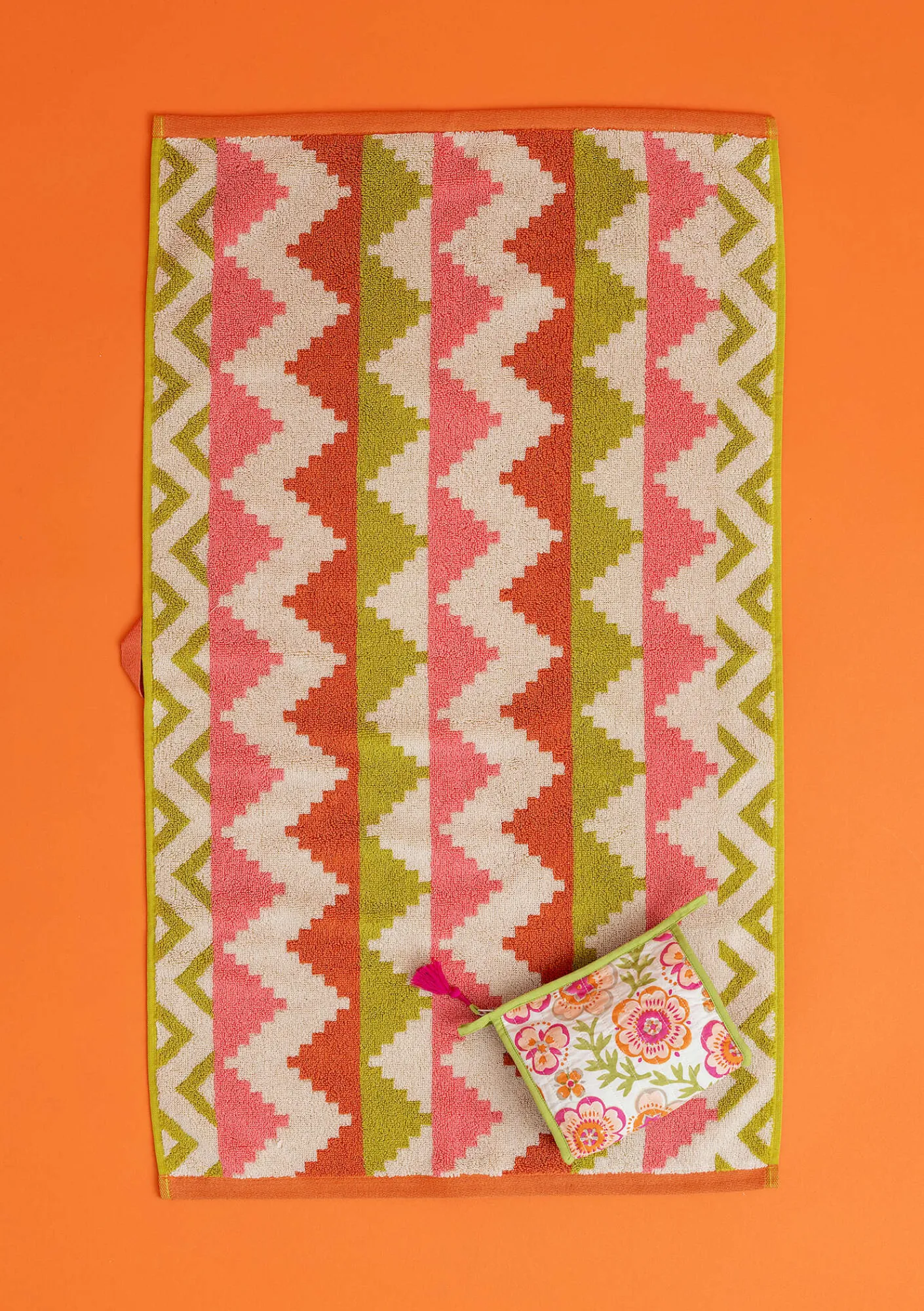 Handduk med grafiskt zick-zackmönster och bårder. Kontrastfärgad kant och hängare på kort- och långsidan.