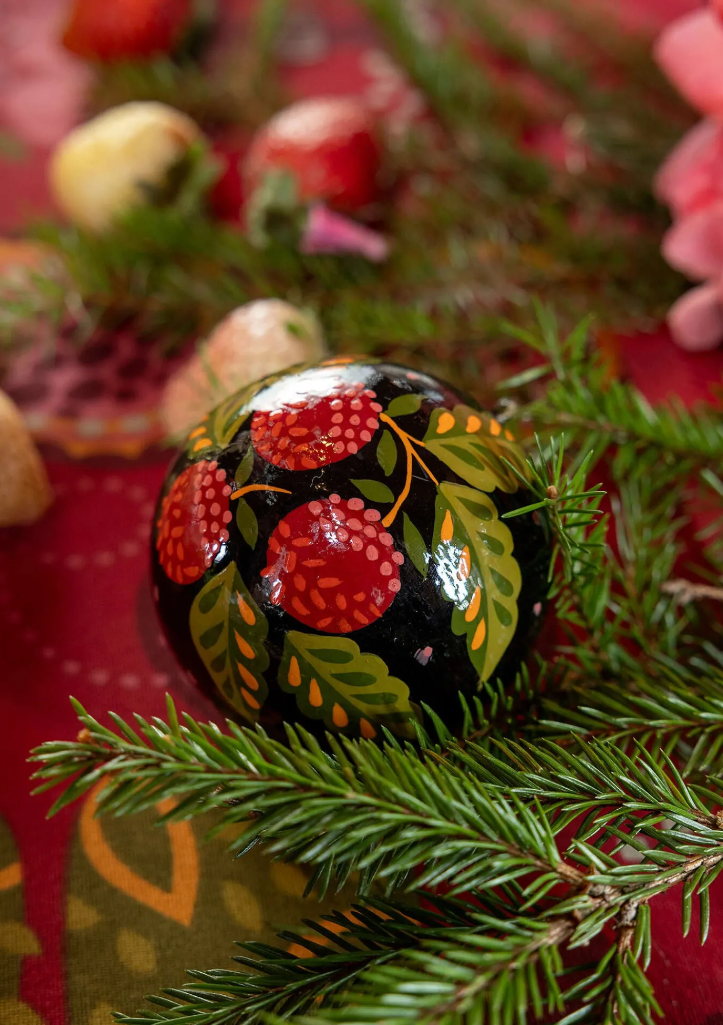 Vår klassiska handmålade julkula i papier maché. Finns i olika mönster och fina färgkombinationer som förgyller hemmet. Hängs med en guldglimrande ögla.