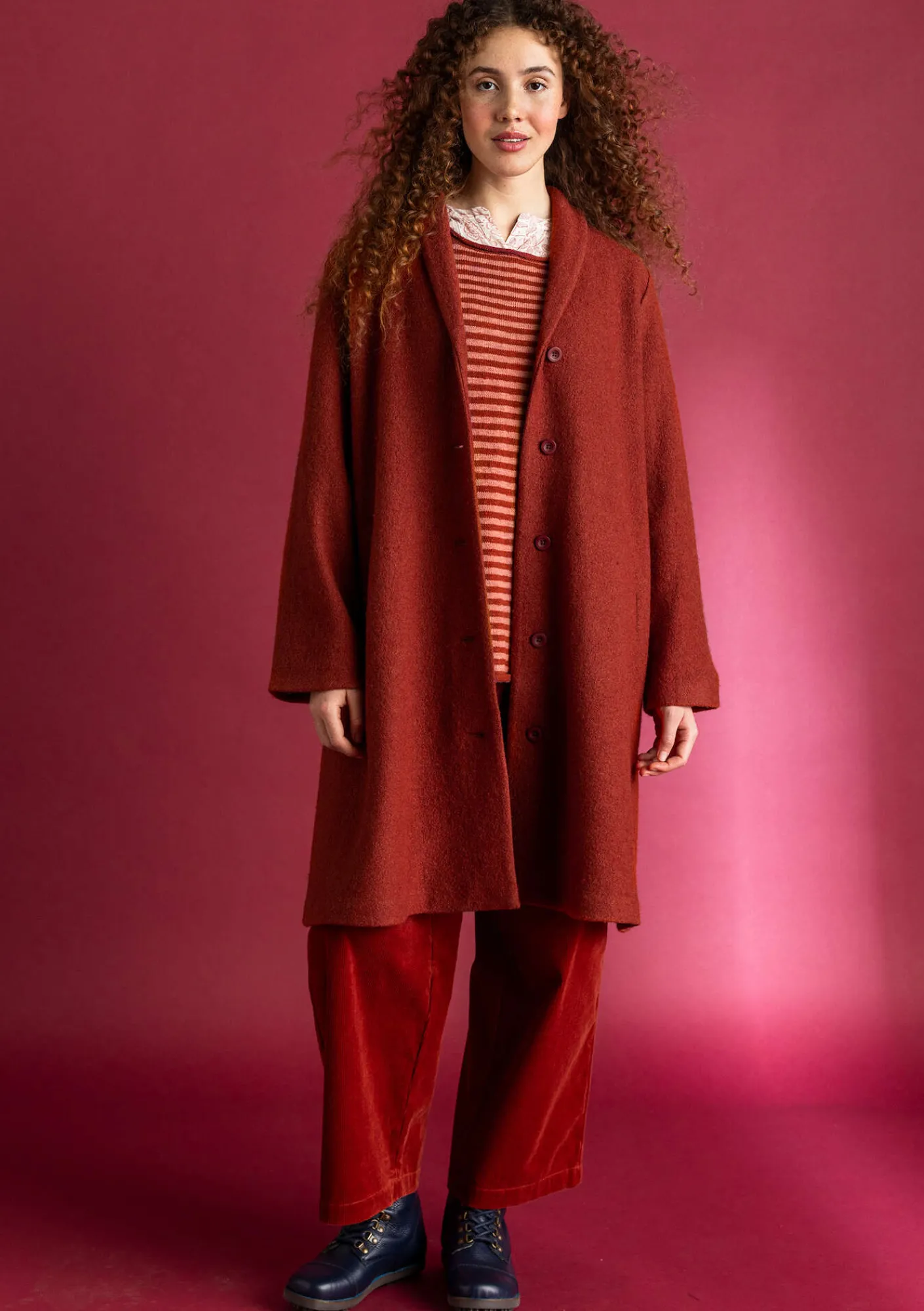 Halvfodrad kappa med nätt sjalkrage i ett bouclégarn som ger en fin ojämnhet som ger ytan liv. Enfärgad med praktiska fickor.