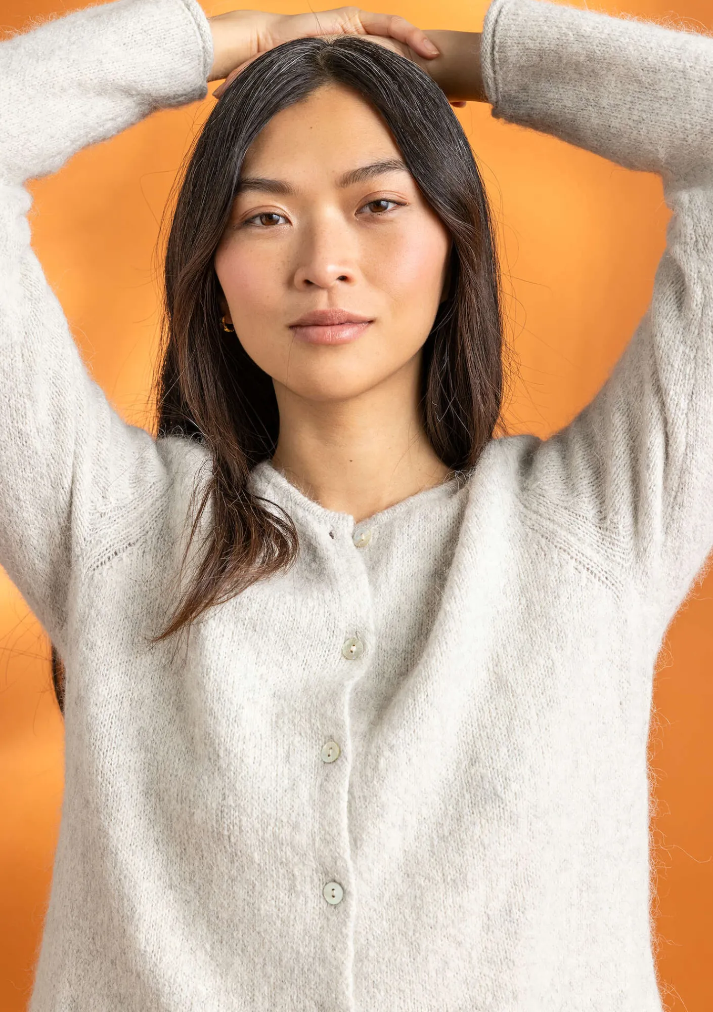 Lättburen kofta i en mjuk alpackamix där vi gjort vårt eget melangegarn. Fickor framtill. Fin liten rullkant i ärmens och nederkantens avslut. Hellång ärm och fina pärlemorknappar.