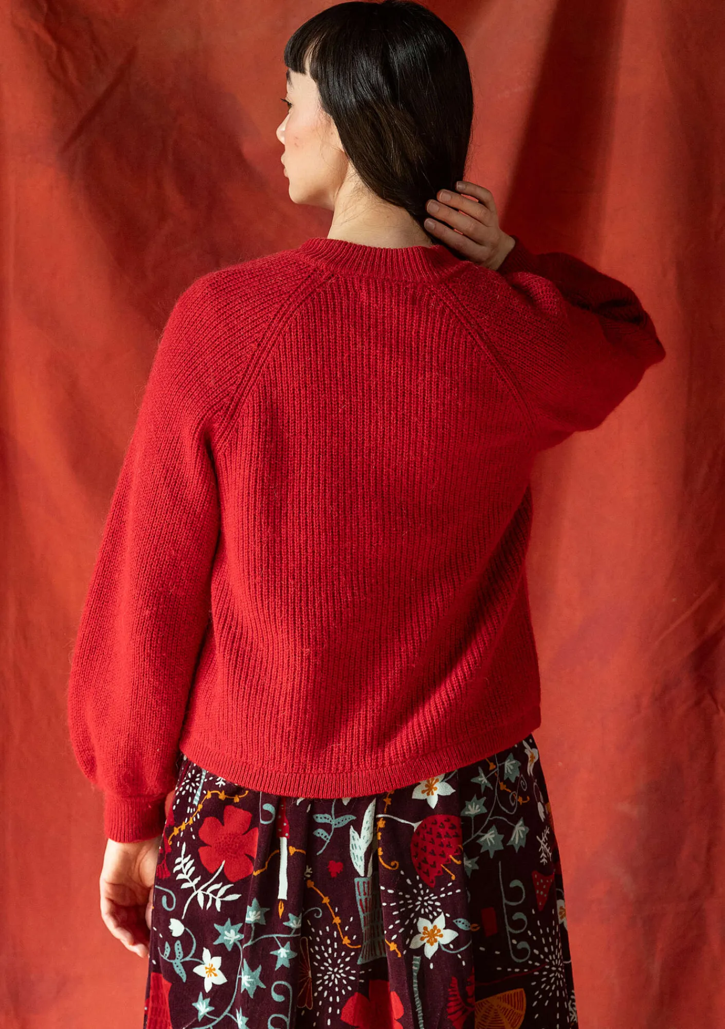 Patentstickad kofta med raglanskärning, hellång puffärm och pärlemorknappar. Ribbstickad krage och ribbade ärmslut.