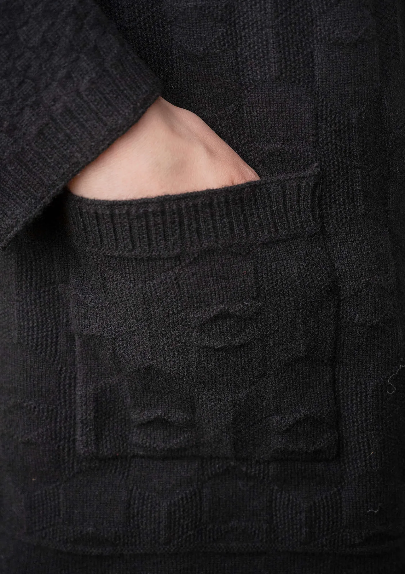 Långkofta med strukturstickade stjärnor och bårder. Rund halsringning, sidslitsar och hellång ärm. Specialstickad ribb i hals, vid ärmslut och på fickans överkant. Träknappar med målad kant och utanpåfickor.