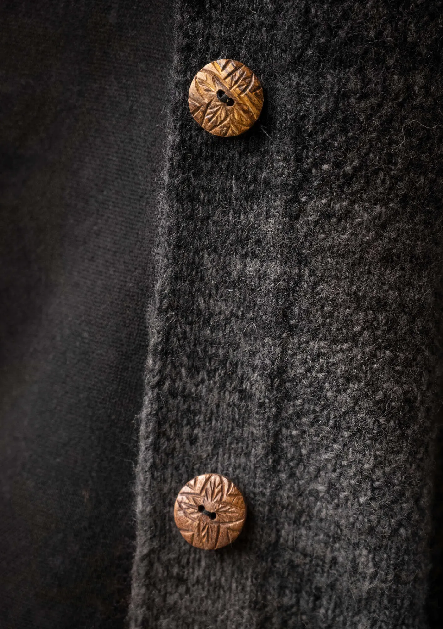 Strukturstickad kofta i ett unikt effektgarn som vi designat själva och är oregelbundet infärgat. Detta gör varje kofta unik med ränder som varierar från plagg till plagg. Modell med utanpåfickor, hellång ärm, rund halsringning och ribbstickade avslut. Ornamenterade knappar i naturfärgat trä.