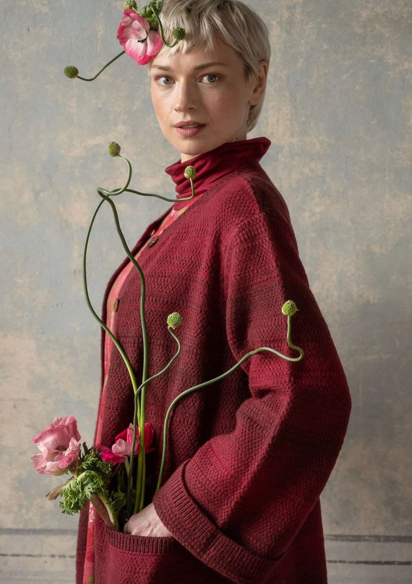 Strukturstickad kofta i ett unikt effektgarn som vi designat själva och är oregelbundet infärgat. Detta gör varje kofta unik med ränder som varierar från plagg till plagg. Modell med utanpåfickor, hellång ärm, rund halsringning och ribbstickade avslut. Ornamenterade knappar i naturfärgat trä.