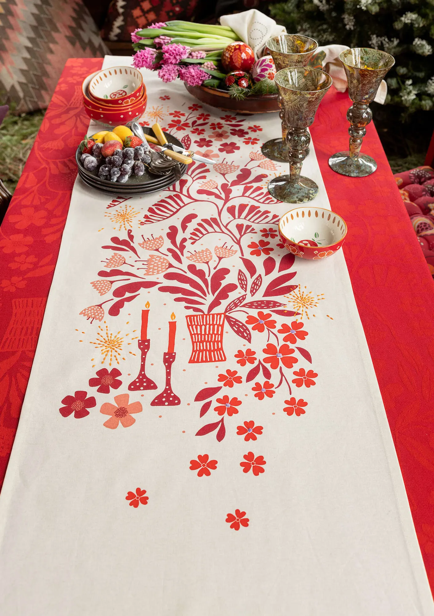 Härlig löpare med tryckt motiv av frodiga blommor och ljusstakar med broderade detaljer som glimrar till. Fin att lägga direkt på bordet, eller i kombination med en annan duk under.