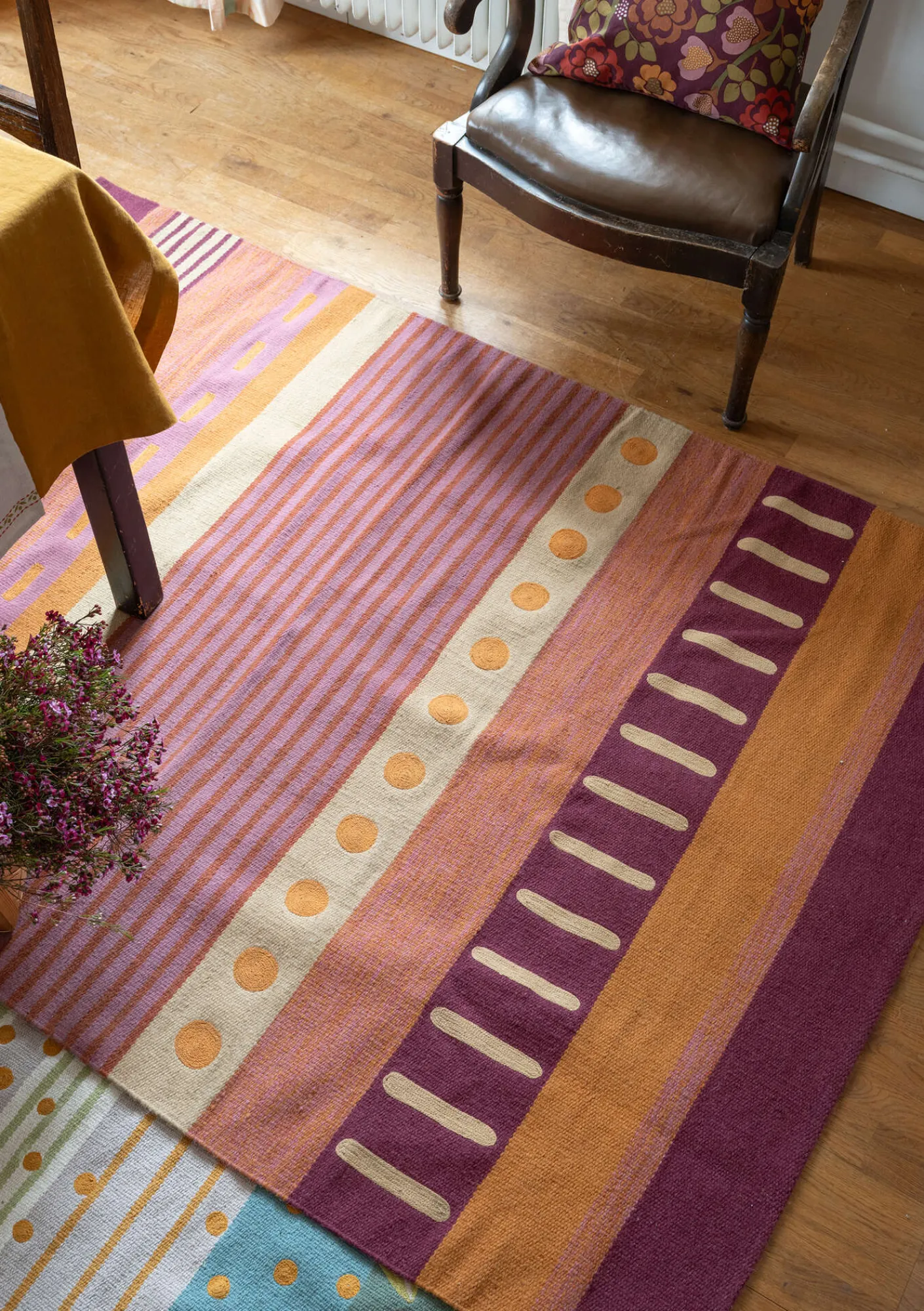 Större randig ullmatta som piggar upp alla slags golv med sin härliga färgmix av oregelbundna ränder. Slitstark ullkvalitet med pigga broderier.