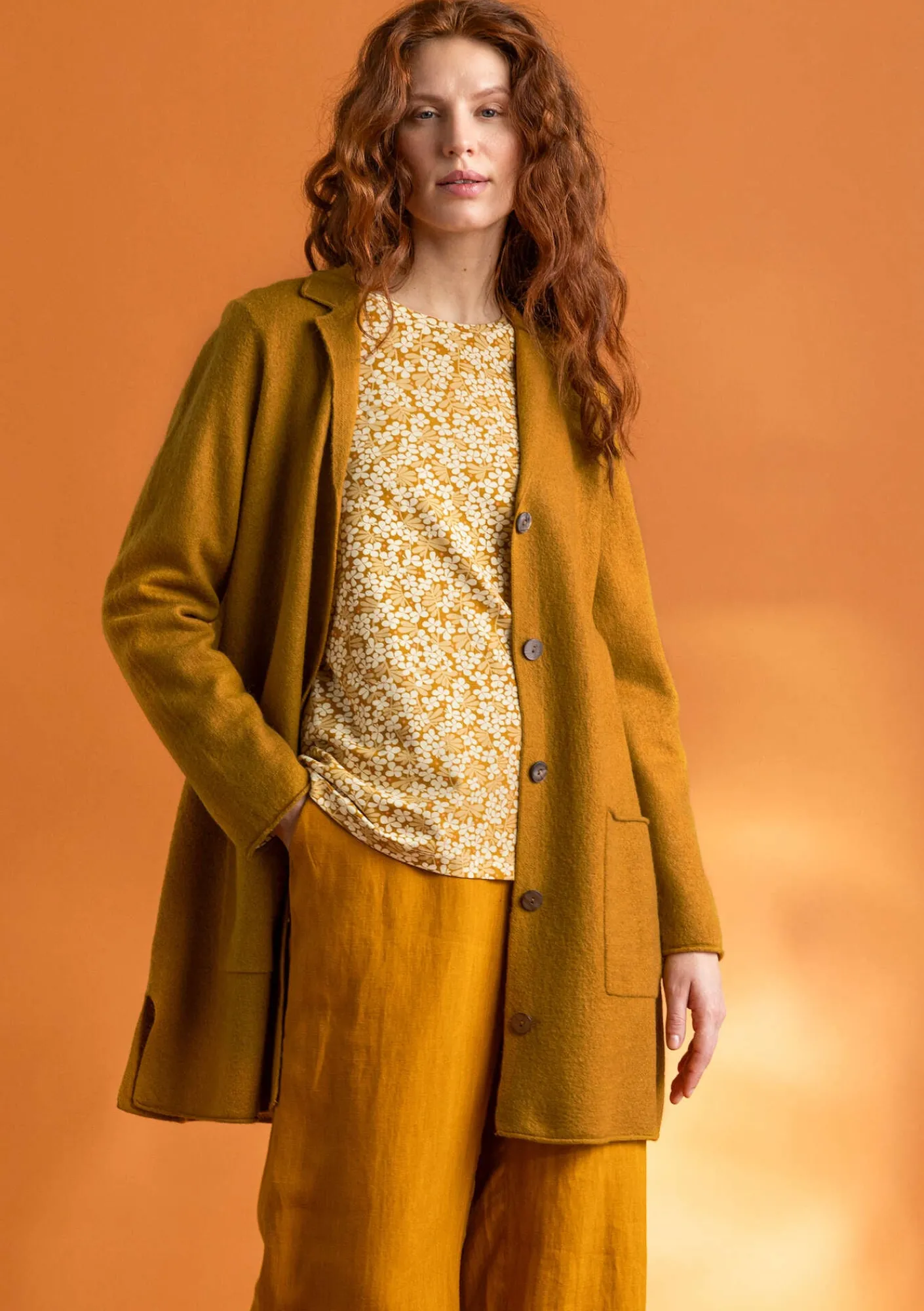 Vår omtyckta, lätt filtade, kavaj i en längre modell. Krage och slag med virkade kanter. Utanpå-fickor och små slitsar i sidorna. Rullkantade avslut och stora pärlemorknappar.