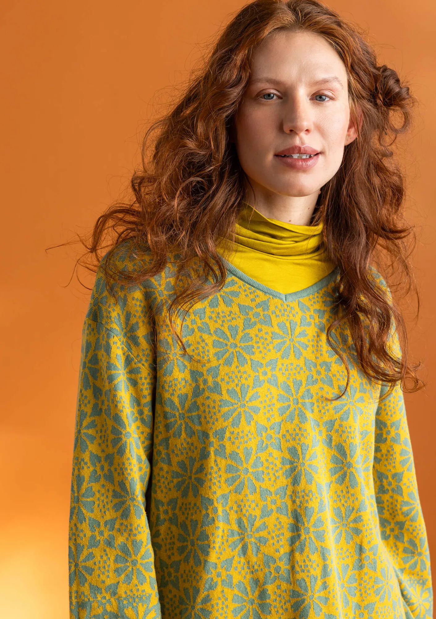 Jacquardstickad tunika med aningen kortare ärm. V-ringad i halsen både fram- och baktill. I ärmens nederkant har vi bytt placering på färgerna, vilket ger plagget en diskret bård.