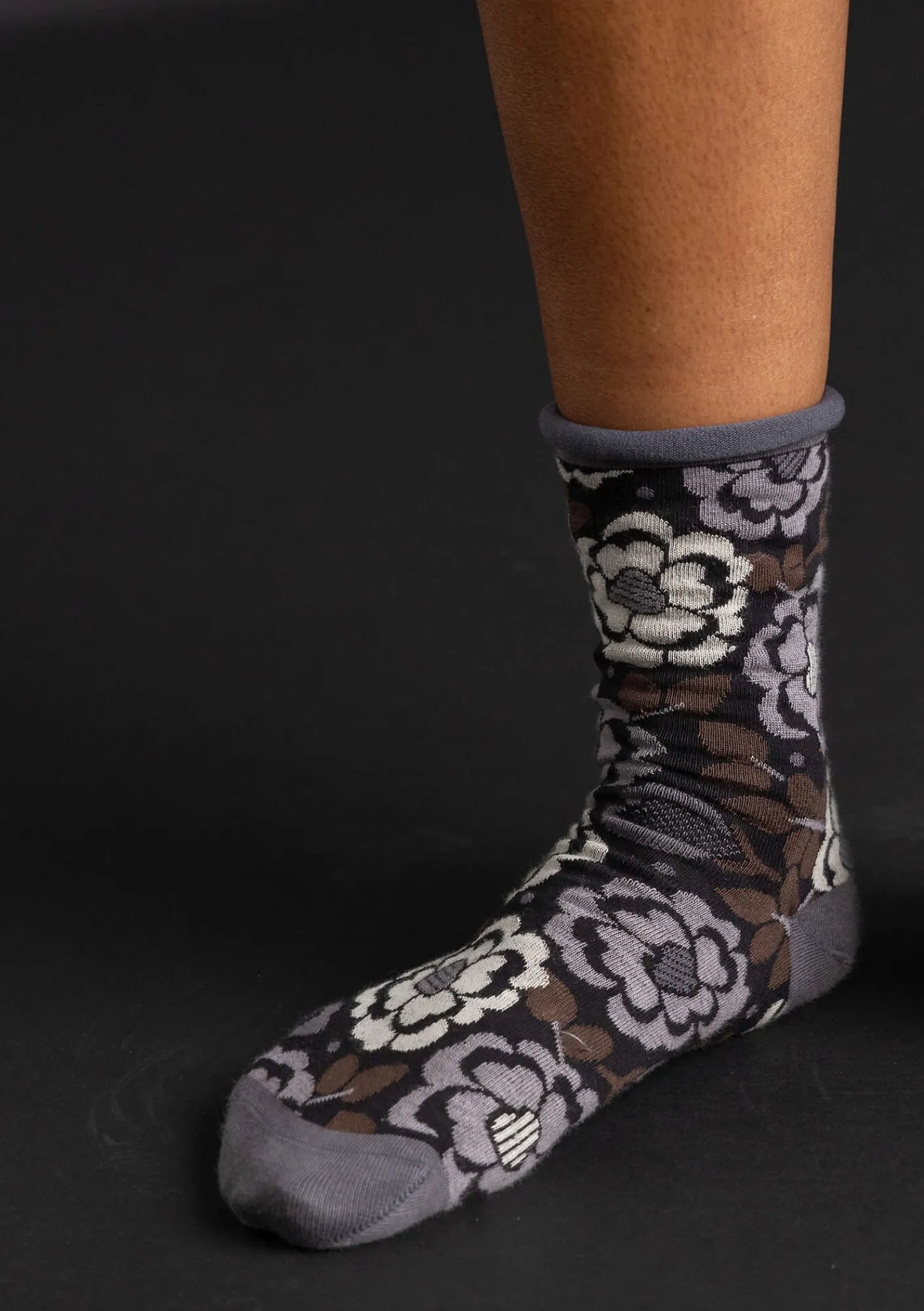 Mjuk och skön strumpa, med fint rosmotiv. Fin och bekväm rullkant, i accentfärg upptill.