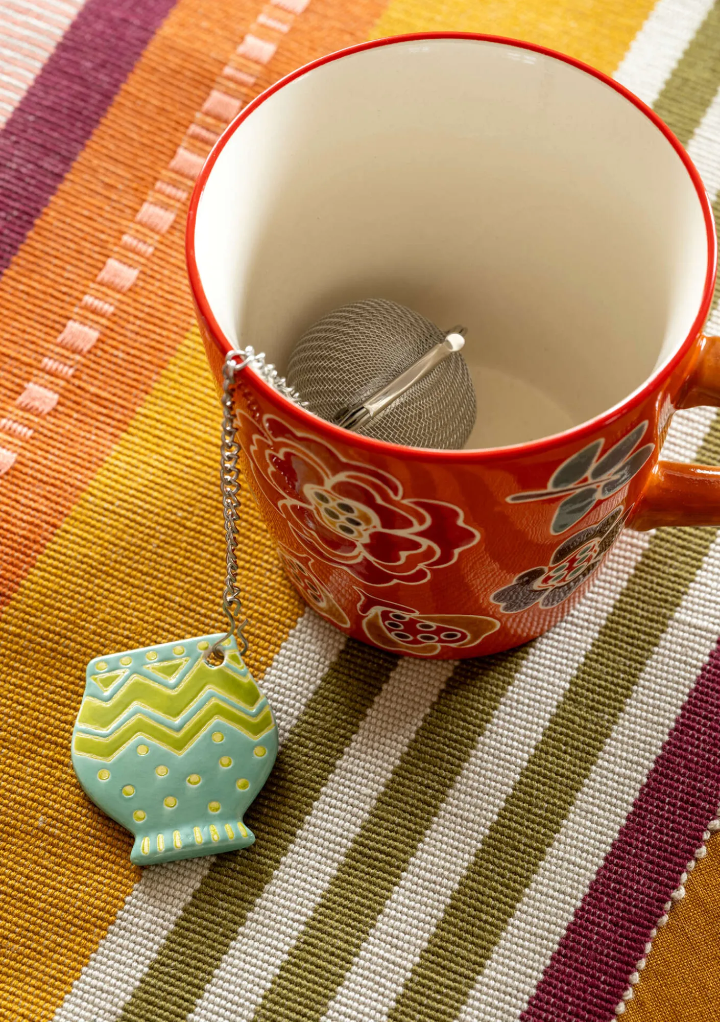 Tesil i metall att brygga en värmade kopp te med. Med ett hänge i keramik i form av en mönstrad blomkruka.