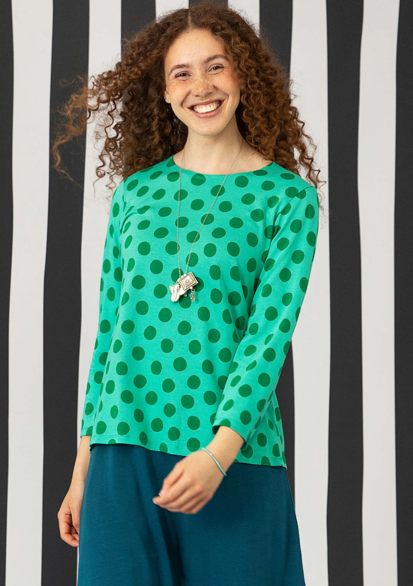 Trikåtop som finns i flera härliga tryckta mönster. Modell med trekvartslång ärm och rund halsringning med fåll.