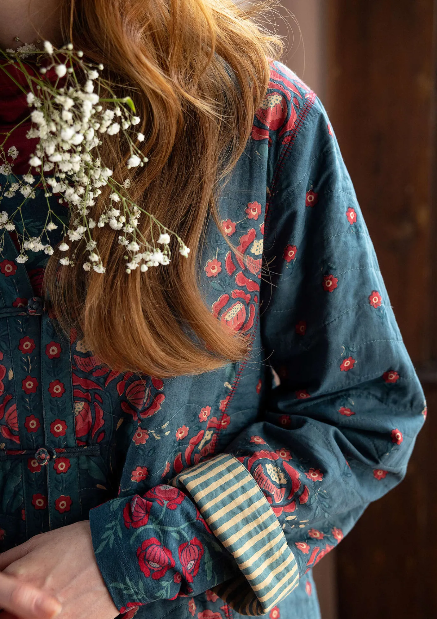 Blocktryckt jacka i en vändbar, rak modell med hellång ärm. Kviltad med ett tunt lager bomullsflanell. Sidfickor och en utanpåficka. Fint arbetad med en broderad blomma på ryggen. Knäpps med textila kinaknappar, i klassisk modell.