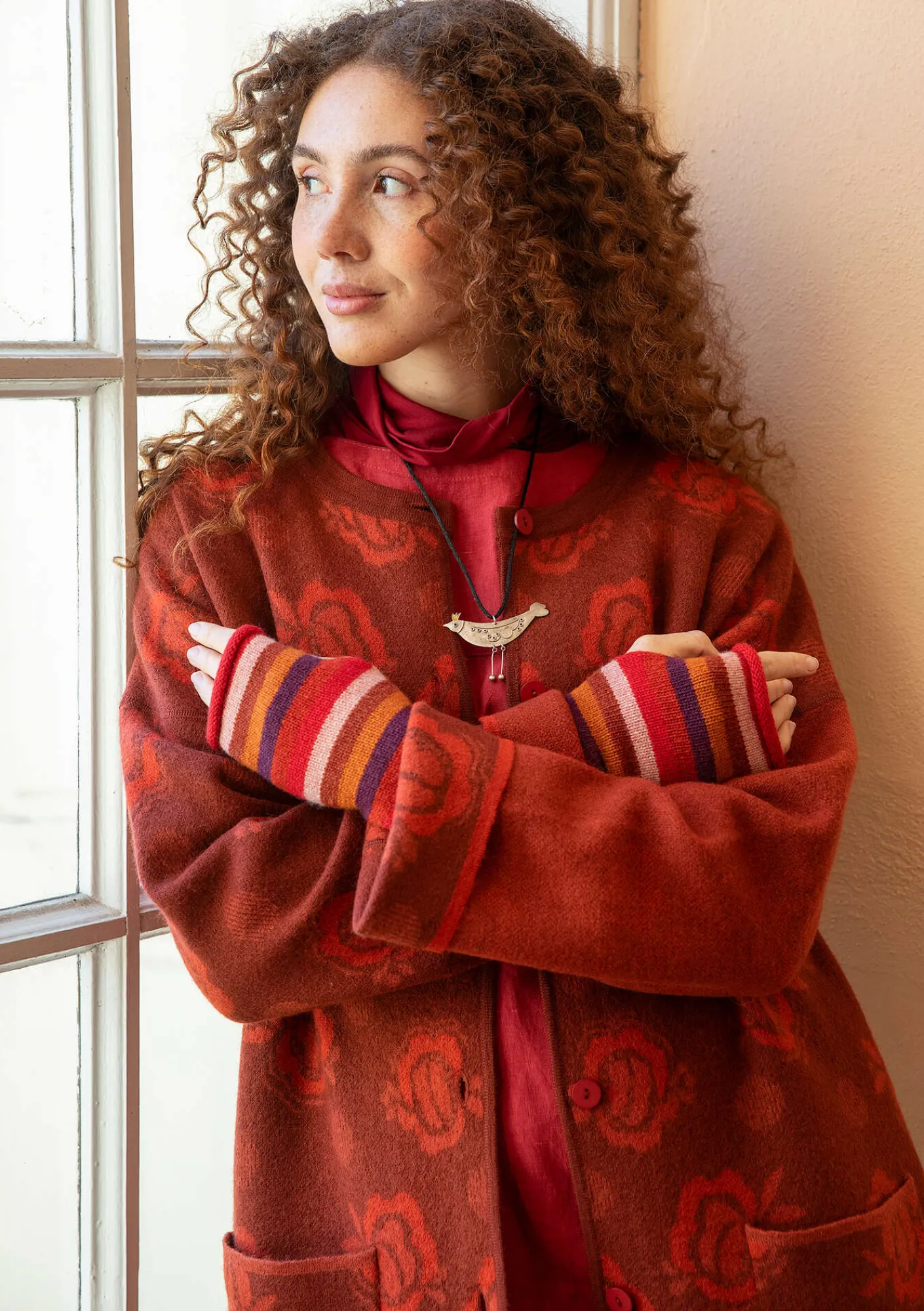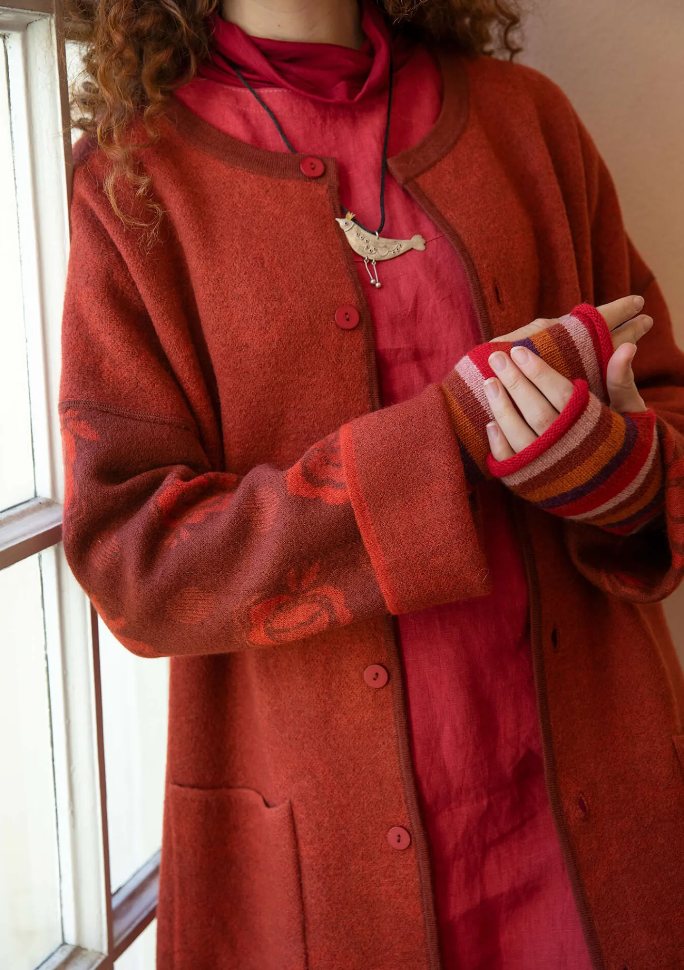 Vändbar, jacquardstickad kappa i filtad ekologisk ull. Ena sidan rosmönstrad och andra enfärgad med melangeffekt. En avvikande ärm där sidorna är omvända. Modell med nedhasad ärm och en rund halsringning. Två utanpåfickor på varje sida av kappan.