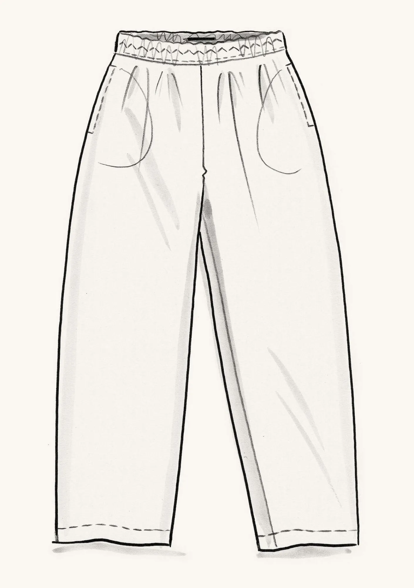 Modell i ankellängd med en insydd resår i midjan och sidfickor.